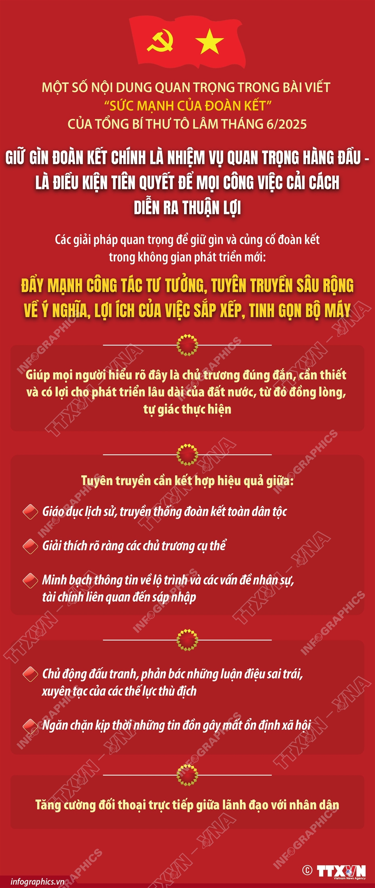 Phổ biến giáo dục Pháp luậtThông tin đồ họa Đẩy mạnh công tác tư tưởng, tuyên truyền sâu rộng về ý nghĩa, lợi ích của việc sắp xếp, tinh gọn bộ máy Thứ hai, 30/06/2025 09:57 Hà Nội (TTXVN 29/6) Trong bài viết “Sức mạnh của đoàn kết” viết tháng 6/2025, Tổng Bí thư Tô Lâm nhấn mạnh, để giữ gìn và củng cố đoàn kết trong không gian phát triển mới, cần triển khai đồng bộ một số giải pháp quan trọng. Một trong những giải pháp đó là đẩy mạnh công tác tư tưởng, tuyên truyền sâu rộng trong toàn thể cán bộ, đảng viên và các tầng lớp nhân dân về ý nghĩa, lợi ích của việc sắp xếp, tinh gọn bộ máy, giúp mọi người hiểu rõ đây là chủ trương đúng đắn, cần thiết và có lợi cho phát triển lâu dài của đất nước, từ đó đồng lòng, tự giác thực hiện. Việc tuyên truyền cần kết hợp hiệu quả giữa giáo dục lịch sử, truyền thống đoàn kết toàn dân tộc với việc giải thích rõ ràng các chủ trương cụ thể, minh bạch thông tin về lộ trình và các vấn đề nhân sự, tài chính liên quan đến sáp nhập. Đồng thời, phải chủ động đấu tranh, phản bác những luận điệu sai trái, xuyên tạc của các thế lực thù địch, ngăn chặn kịp thời những tin đồn gây mất ổn định xã hội. Đặc biệt, cần tăng cường đối thoại trực tiếp giữa lãnh đạo với nhân dân, giúp giải tỏa những băn khoăn, nghi ngờ, củng cố vững chắc niềm tin và sự đoàn kết trong toàn xã hội.