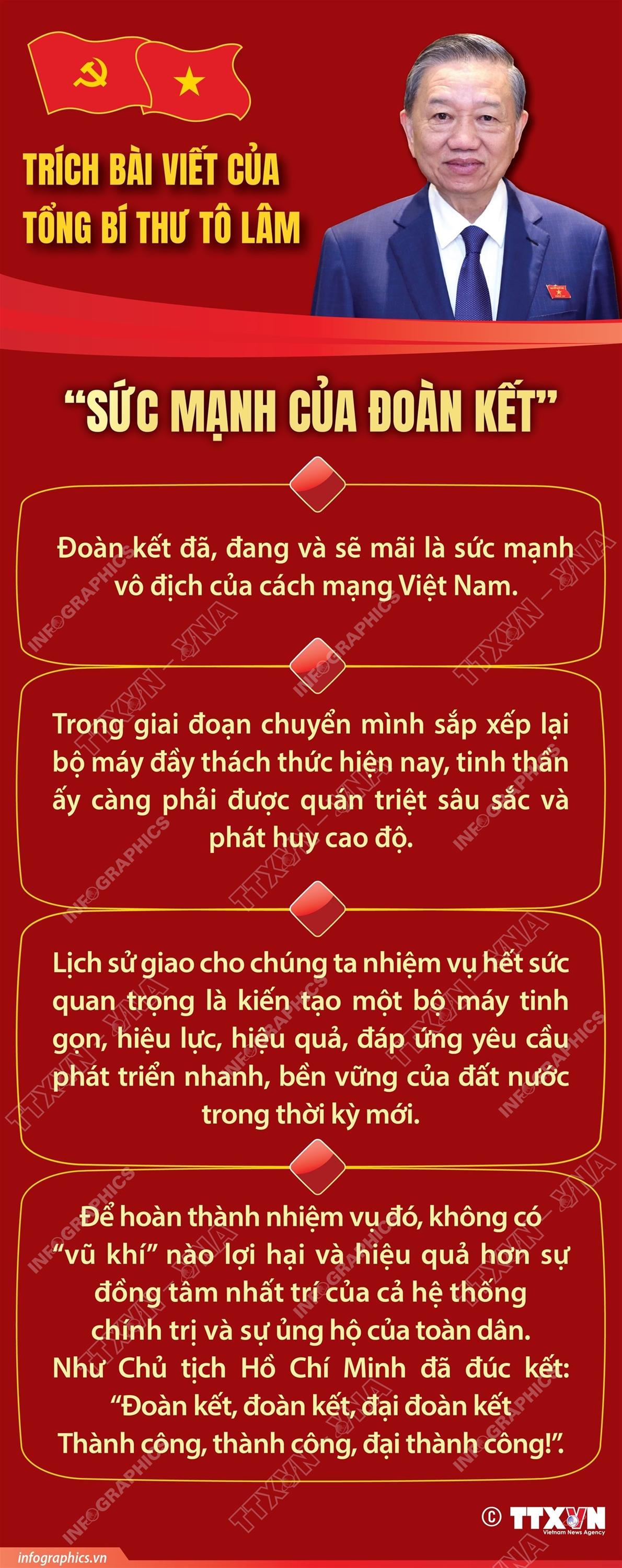 Phổ biến giáo dục Pháp luậtThông tin đồ họa Đoàn kết đã, đang và sẽ mãi là sức mạnh vô địch của cách mạng Việt Nam Thứ hai, 30/06/2025 09:58 Hà Nội (TTXVN 29/6) Trong bài viết "Sức mạnh của đoàn kết" viết tháng 6/2025, Tổng Bí thư Tô Lâm khẳng định: Đoàn kết đã, đang và sẽ mãi là sức mạnh vô địch của cách mạng Việt Nam. Trong giai đoạn chuyển mình sắp xếp lại bộ máy đầy thách thức hiện nay, tinh thần ấy càng phải được quán triệt sâu sắc và phát huy cao độ. Lịch sử giao cho chúng ta nhiệm vụ hết sức quan trọng là kiến tạo một bộ máy tinh gọn, hiệu lực, hiệu quả, đáp ứng yêu cầu phát triển nhanh, bền vững của đất nước trong thời kỳ mới. Để hoàn thành nhiệm vụ đó, không có “vũ khí” nào lợi hại và hiệu quả hơn sự đồng tâm nhất trí của cả hệ thống chính trị và sự ủng hộ của toàn dân. Như Chủ tịch Hồ Chí Minh đã đúc kết: “Đoàn kết, đoàn kết, đại đoàn kết - Thành công, thành công, đại thành công!”.