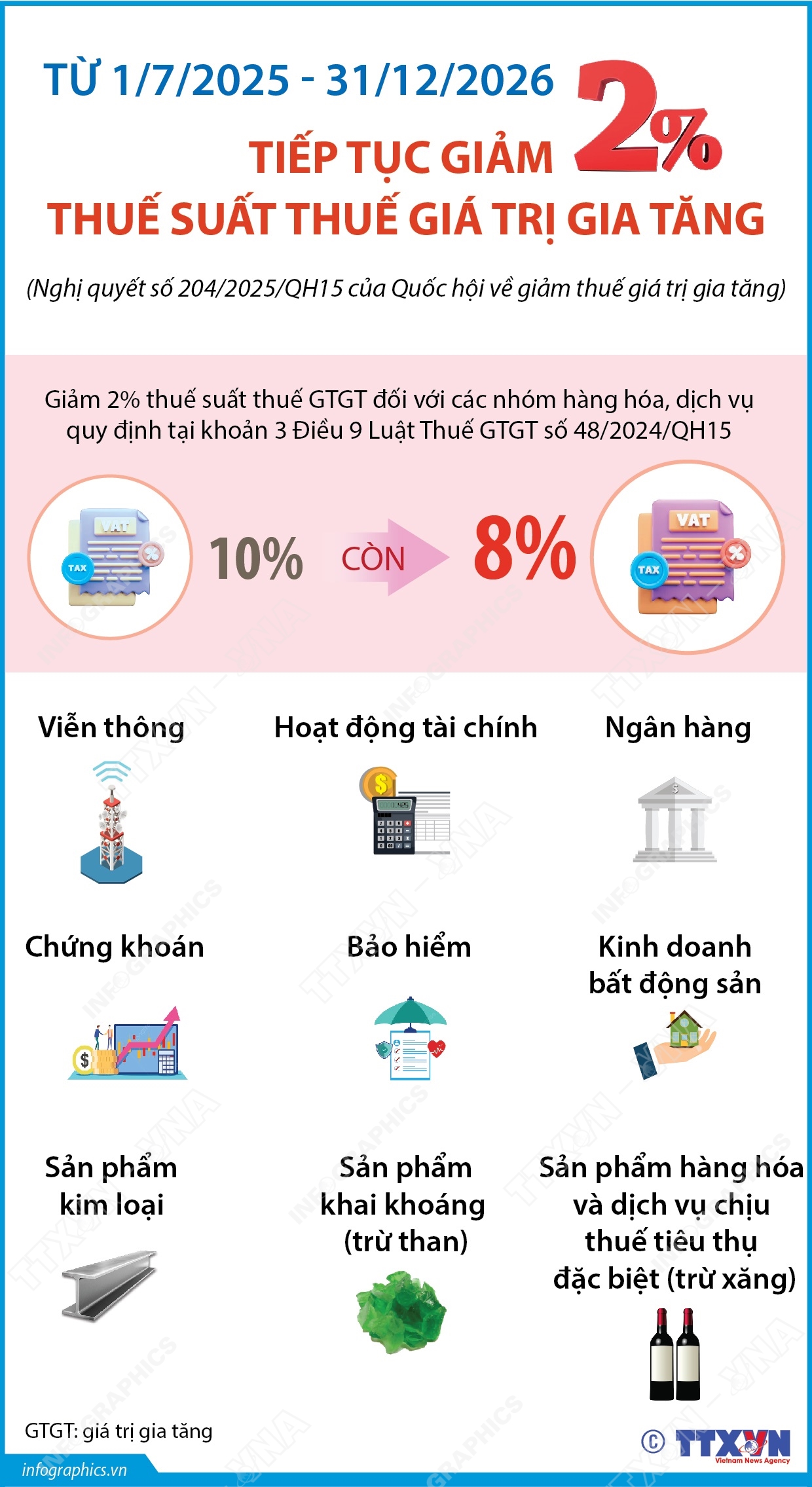 Phổ biến giáo dục Pháp luậtThông tin đồ họa Từ 1/7/2025 - 31/12/2026: Tiếp tục giảm 2% thuế suất thuế giá trị gia tăng Thứ sáu, 04/07/2025 10:17 Hà Nội (TTXVN 1/7) Chủ tịch Quốc hội Trần Thanh Mẫn đã ký ban hành Nghị quyết số 204/2025/QH15 của Quốc hội về giảm thuế giá trị gia tăng. Theo đó, Quốc hội quyết nghị giảm 2% thuế suất thuế giá trị gia tăng, áp dụng đối với các nhóm hàng hóa, dịch vụ quy định tại khoản 3, Điều 9 của Luật Thuế giá trị gia tăng số 48/2024/QH15 (còn 8%), trừ một số nhóm hàng hóa, dịch vụ sau: viễn thông, hoạt động tài chính, ngân hàng, chứng khoán, bảo hiểm, kinh doanh bất động sản, sản phẩm kim loại, sản phẩm khai khoáng (trừ than), sản phẩm hàng hóa và dịch vụ chịu thuế tiêu thụ đặc biệt (trừ xăng). Nghị quyết này có hiệu lực thi hành từ ngày 1/7/2025 đến hết ngày 31/12/2026.