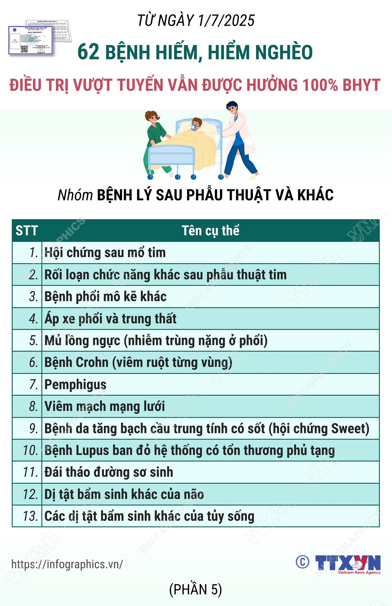 Phổ biến giáo dục Pháp luậtThông tin đồ họa 62 bệnh hiếm, hiểm nghèo điều trị vượt tuyến vẫn được hưởng 100% BHYT: Nhóm Bệnh lý sau phẫu thuật và khác Thứ sáu, 04/07/2025 10:24 Hà Nội (TTXVN 2/7) Theo Luật sửa đổi, bổ sung một số điều của Luật Bảo hiểm y tế (BHYT), từ 1/7/2025, người tham gia BHYT tự đi khám bệnh, chữa bệnh không đúng cơ sở đăng ký khám bệnh, chữa bệnh BHYT ban đầu, không đúng quy định về chuyển người bệnh quy định tại Điều 26 và Điều 27 của Luật này được thanh toán 100% mức hưởng khi khám bệnh, chữa bệnh tại cơ sở khám bệnh, chữa bệnh cấp cơ bản hoặc cấp chuyên sâu trong trường hợp chẩn đoán xác định, điều trị một số bệnh hiếm, bệnh hiểm nghèo, bệnh cần phẫu thuật hoặc sử dụng kỹ thuật cao do Bộ trưởng Bộ Y tế quy định. Danh mục bệnh hiểm nghèo được quy định tại Thông tư 01/2025/TT-BYT ngày 01/01/2025 của của Bộ Y tế.