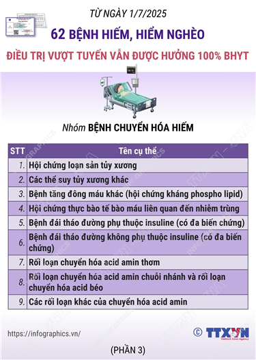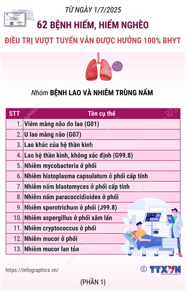 Tin cùng chuyên mục Thông tin chi tiết sắp xếp các đơn vị hành chính cấp xã của tỉnh Đồng Tháp04/07/2025 10:29Hà Nội (TTXVN 2/7) Theo Nghị quyết số 1663/NQ-UBTVQH15 ngày 16/6/2025 của Ủy ban Thường vụ Quốc hội, sau khi sắp xếp, tỉnh Đồng Tháp có 102 đơn vị hành chính cấp xã, gồm 82 xã và 20 phường. Thông tin chi tiết sắp xếp các đơn vị hành chính cấp xã của tỉnh An Giang04/07/2025 10:28Hà Nội (TTXVN 2/7) Theo Nghị quyết số 1654/NQ-UBTVQH15 ngày 16/6/2025 của Ủy ban Thường vụ Quốc hội, sau khi sắp xếp, tỉnh An Giang có 102 đơn vị hành chính cấp xã, gồm 85 xã, 14 phường và 03 đặc khu; trong đó có 79 xã, 14 phường, 03 đặc khu hình... 62 bệnh hiếm, hiểm nghèo điều trị vượt tuyến vẫn được hưởng 100% BHYT: Nhóm Dị tật bẩm sinh và di chứng04/07/2025 10:25Hà Nội (TTXVN 2/7) Theo Luật sửa đổi, bổ sung một số điều của Luật Bảo hiểm y tế (BHYT), từ 1/7/2025, người tham gia BHYT tự đi khám bệnh, chữa bệnh không đúng cơ sở đăng ký khám bệnh, chữa bệnh BHYT ban đầu, không đúng quy định về chuyển người bệnh quy định tại Điều 26 và Điều 27 của... 62 bệnh hiếm, hiểm nghèo điều trị vượt tuyến vẫn được hưởng 100% BHYT: Nhóm Bệnh lý sau phẫu thuật và khác04/07/2025 10:24Hà Nội (TTXVN 2/7) Theo Luật sửa đổi, bổ sung một số điều của Luật Bảo hiểm y tế (BHYT), từ 1/7/2025, người tham gia BHYT tự đi khám bệnh, chữa bệnh không đúng cơ sở đăng ký khám bệnh, chữa bệnh BHYT ban đầu, không đúng quy định về chuyển người bệnh quy định tại Điều 26 và Điều 27 của... 62 bệnh hiếm, hiểm nghèo điều trị vượt tuyến vẫn được hưởng 100% BHYT: Nhóm Bệnh chuyển hóa hiếm04/07/2025 10:23Hà Nội (TTXVN 2/7) Theo Luật sửa đổi, bổ sung một số điều của Luật Bảo hiểm y tế (BHYT), từ 1/7/2025, người tham gia BHYT tự đi khám bệnh, chữa bệnh không đúng cơ sở đăng ký khám bệnh, chữa bệnh BHYT ban đầu, không đúng quy định về chuyển người bệnh quy định tại Điều 26 và Điều 27 của... 62 bệnh hiếm, hiểm nghèo điều trị vượt tuyến vẫn được hưởng 100% BHYT: Nhóm Bệnh lao và nhiễm trùng nấm04/07/2025 10:22Hà Nội (TTXVN 2/7) Theo Luật sửa đổi, bổ sung một số điều của Luật Bảo hiểm y tế (BHYT), từ 1/7/2025, người tham gia BHYT tự đi khám bệnh, chữa bệnh không đúng cơ sở đăng ký khám bệnh, chữa bệnh BHYT ban đầu, không đúng quy định về chuyển người bệnh quy định tại Điều 26 và Điều 27 của...
