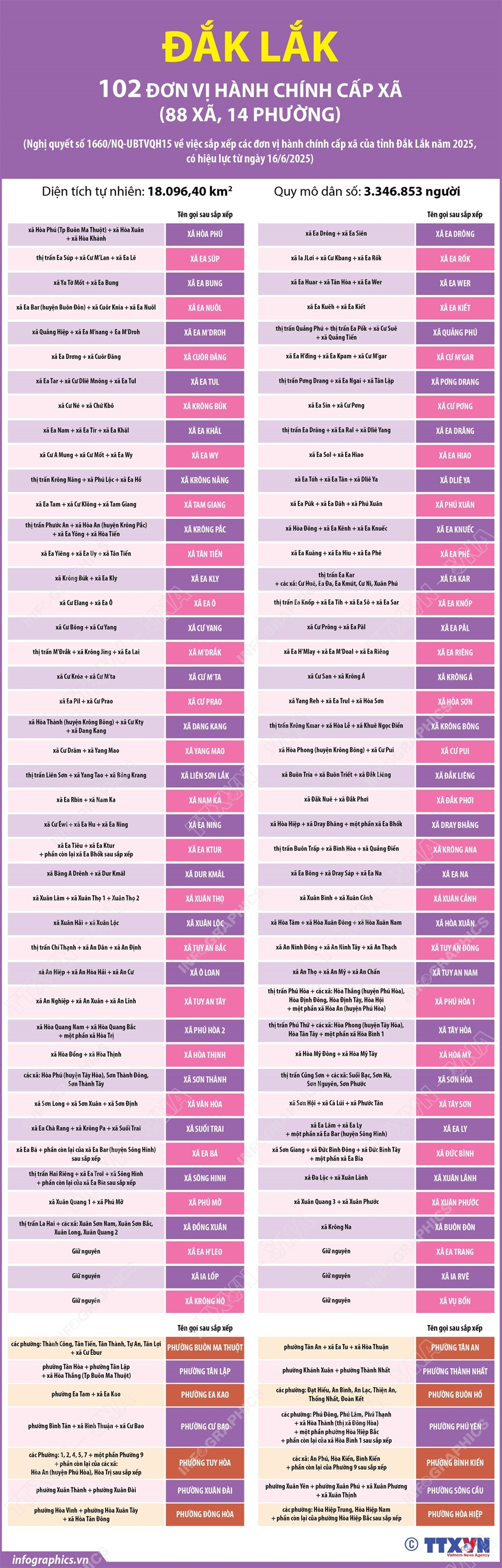 Phổ biến giáo dục Pháp luậtThông tin đồ họa Thông tin chi tiết sắp xếp các đơn vị hành chính cấp xã của tỉnh Đắk Lắk Thứ sáu, 04/07/2025 10:31 Hà Nội (TTXVN 2/7) Theo Nghị quyết số 1660/NQ-UBTVQH15 ngày 16/6/2025 của Ủy ban Thường vụ Quốc hội, sau khi sắp xếp, tỉnh Đắk Lắk có 102 đơn vị hành chính cấp xã, gồm 88 xã và 14 phường; trong đó có 82 xã, 14 phường hình thành sau sắp xếp, thực hiện đổi tên quy định tại Điều này và 06 xã không thực hiện sắp xếp là các xã Ea H’Leo, Ea Trang, Ia Lốp, Ia Rvê, Krông Nô, Vụ Bổn.