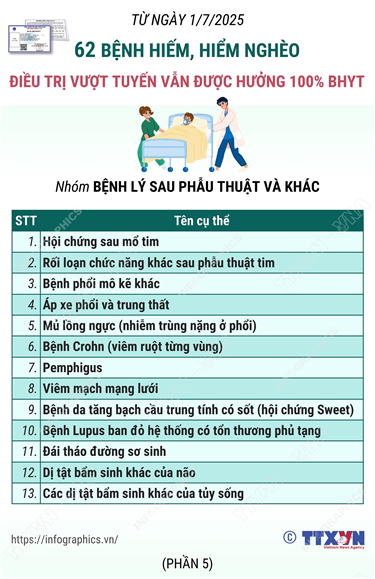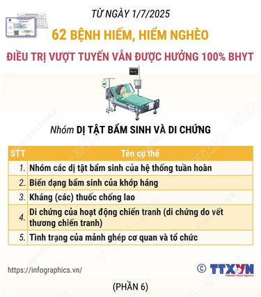 Tin cùng chuyên mục Thông tin chi tiết sắp xếp các đơn vị hành chính cấp xã của tỉnh Gia Lai04/07/2025 10:32Hà Nội (TTXVN 27/6) Theo Nghị quyết số 1664/NQ-UBTVQH15 ngày 16/6/2025 của Ủy ban Thường vụ Quốc hội, sau khi sắp xếp, tỉnh Gia Lai có 135 đơn vị hành chính cấp xã, gồm 110 xã và 25 phường; trong đó có 101 xã, 25 phường hình thành sau sắp xếp quy định... Thông tin chi tiết sắp xếp các đơn vị hành chính cấp xã của tỉnh Đắk Lắk04/07/2025 10:31Hà Nội (TTXVN 2/7) Theo Nghị quyết số 1660/NQ-UBTVQH15 ngày 16/6/2025 của Ủy ban Thường vụ Quốc hội, sau khi sắp xếp, tỉnh Đắk Lắk có 102 đơn vị hành chính cấp xã, gồm 88 xã và 14 phường; trong đó có 82 xã, 14 phường hình thành sau sắp xếp, thực... Thông tin chi tiết sắp xếp các đơn vị hành chính cấp xã của tỉnh Đồng Tháp04/07/2025 10:29Hà Nội (TTXVN 2/7) Theo Nghị quyết số 1663/NQ-UBTVQH15 ngày 16/6/2025 của Ủy ban Thường vụ Quốc hội, sau khi sắp xếp, tỉnh Đồng Tháp có 102 đơn vị hành chính cấp xã, gồm 82 xã và 20 phường. Thông tin chi tiết sắp xếp các đơn vị hành chính cấp xã của tỉnh An Giang04/07/2025 10:28Hà Nội (TTXVN 2/7) Theo Nghị quyết số 1654/NQ-UBTVQH15 ngày 16/6/2025 của Ủy ban Thường vụ Quốc hội, sau khi sắp xếp, tỉnh An Giang có 102 đơn vị hành chính cấp xã, gồm 85 xã, 14 phường và 03 đặc khu; trong đó có 79 xã, 14 phường, 03 đặc khu hình... 62 bệnh hiếm, hiểm nghèo điều trị vượt tuyến vẫn được hưởng 100% BHYT: Nhóm Dị tật bẩm sinh và di chứng04/07/2025 10:25Hà Nội (TTXVN 2/7) Theo Luật sửa đổi, bổ sung một số điều của Luật Bảo hiểm y tế (BHYT), từ 1/7/2025, người tham gia BHYT tự đi khám bệnh, chữa bệnh không đúng cơ sở đăng ký khám bệnh, chữa bệnh BHYT ban đầu, không đúng quy định về chuyển người bệnh quy định tại Điều 26 và Điều 27 của... 62 bệnh hiếm, hiểm nghèo điều trị vượt tuyến vẫn được hưởng 100% BHYT: Nhóm Bệnh lý sau phẫu thuật và khác04/07/2025 10:24Hà Nội (TTXVN 2/7) Theo Luật sửa đổi, bổ sung một số điều của Luật Bảo hiểm y tế (BHYT), từ 1/7/2025, người tham gia BHYT tự đi khám bệnh, chữa bệnh không đúng cơ sở đăng ký khám bệnh, chữa bệnh BHYT ban đầu, không đúng quy định về chuyển người bệnh quy định tại Điều 26 và Điều 27 của...