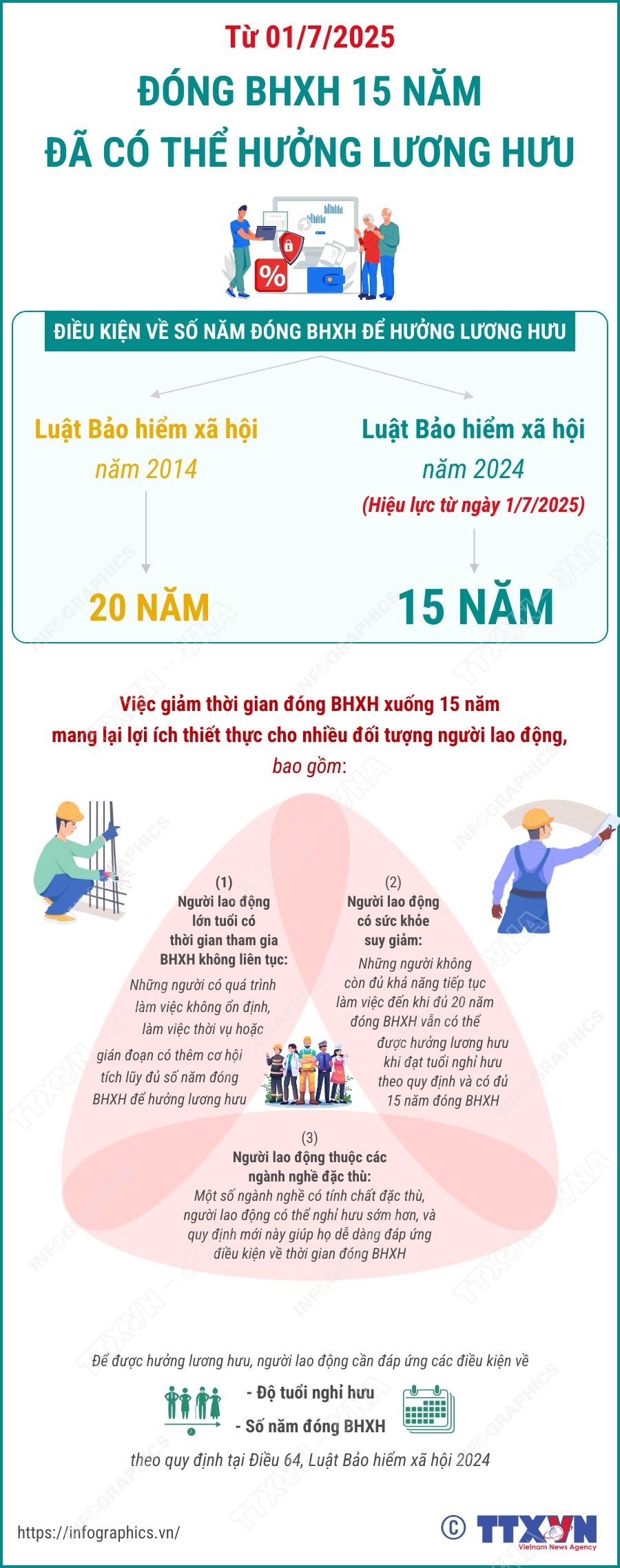 Phổ biến giáo dục Pháp luậtThông tin đồ họa Từ ngày 1/7/2025, đóng BHXH 15 năm đã có thể được hưởng lương hưu Thứ sáu, 04/07/2025 10:33 Hà Nội (TTXVN 2/7) Từ ngày 1/7/2025, người tham gia đóng bảo hiểm xã hội (BHXH) từ đủ 15 năm đã có thể được hưởng lương hưu hằng tháng thay vì 20 năm như trước. Đây là một thay đổi lớn trong chính sách BHXH được quy định tại Luật Bảo hiểm xã hội năm 2024, mở ra cơ hội nhận lương hưu cho nhiều người đã và đang tham gia đóng BHXH theo cả hai hình thức bắt buộc và nguyện.