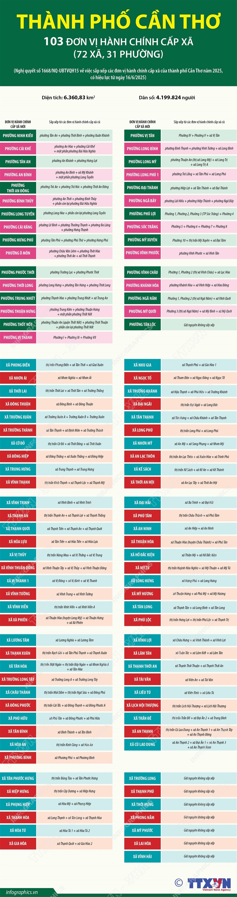 Phổ biến giáo dục Pháp luậtThông tin đồ họa Thông tin chi tiết sắp xếp các đơn vị hành chính cấp xã của thành phố Cần Thơ Thứ sáu, 04/07/2025 10:35 Hà Nội (TTXVN 3/7) Theo Nghị quyết số 1668/NQ-UBTVQH15 ngày 16/6/2025 của Ủy ban Thường vụ Quốc hội, sau khi sắp xếp, thành phố Cần Thơ có 103 đơn vị hành chính cấp xã, gồm 31 phường và 72 xã; trong đó có 30 phường, 65 xã hình thành sau sắp xếp quy định tại Điều này và 08 đơn vị hành chính cấp xã không thực hiện sắp xếp là phường Tân Lộc, các xã Trường Long, Thạnh Phú, Thới Hưng, Phong Nẫm, Mỹ Phước, Lai Hòa, Vĩnh Hải.