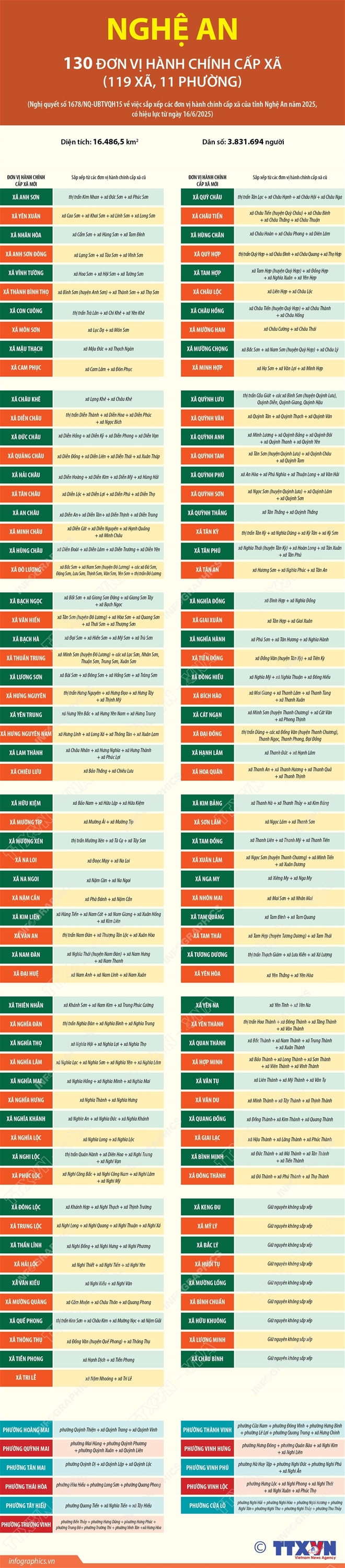 Phổ biến giáo dục Pháp luậtThông tin đồ họa Thông tin chi tiết sắp xếp các đơn vị hành chính cấp xã của tỉnh Nghệ An Thứ sáu, 04/07/2025 10:42 Hà Nội (TTXVN 3/7) Theo Nghị quyết số 1678/NQ-UBTVQH15 ngày 16/6/2025 của Ủy ban Thường vụ Quốc hội, sau khi sắp xếp, tỉnh Nghệ An có 130 đơn vị hành chính cấp xã, gồm 119 xã và 11 phường.