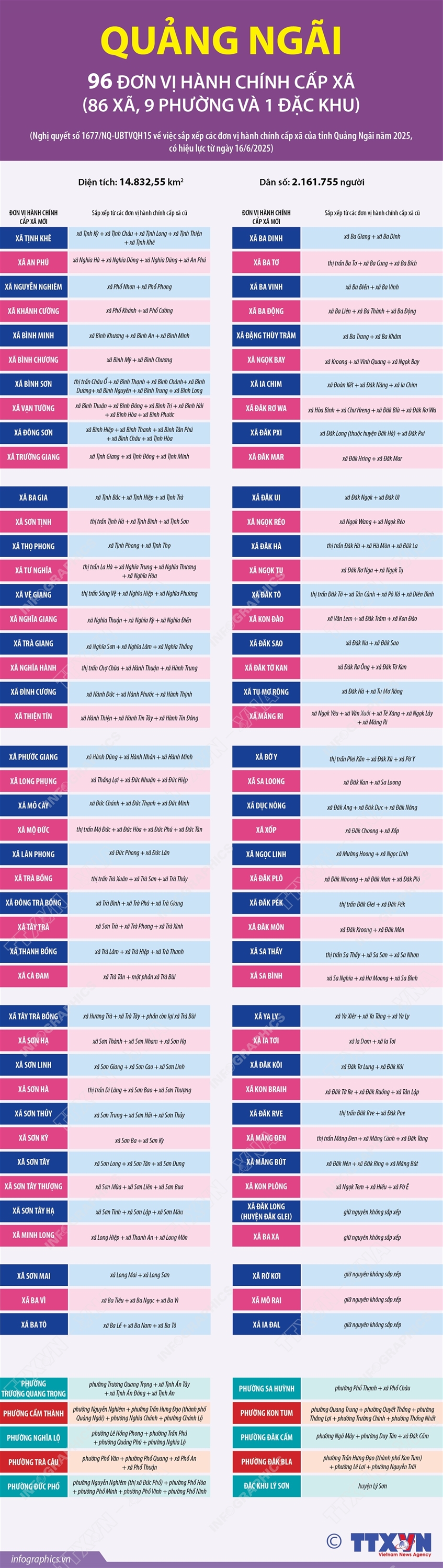 Phổ biến giáo dục Pháp luậtThông tin đồ họa Thông tin chi tiết sắp xếp các đơn vị hành chính cấp xã của tỉnh Quảng Ngãi Thứ sáu, 04/07/2025 10:55 Hà Nội (TTXVN 4/7) Theo Nghị quyết số 1677/NQ-UBTVQH15 ngày 16/6/2025 của Ủy ban Thường vụ Quốc hội, sau khi sắp xếp, tỉnh Quảng Ngãi có 96 đơn vị hành chính cấp xã, gồm 86 xã, 09 phường và 01 đặc khu; trong đó có 81 xã, 09 phường, 01 đặc khu hình thành sau sắp xếp quy định tại Điều này và 05 xã không thực hiện sắp xếp là các xã Đăk Long (huyện Đăk Glei), Ba Xa, Rờ Kơi, Mô Rai, Ia Đal.