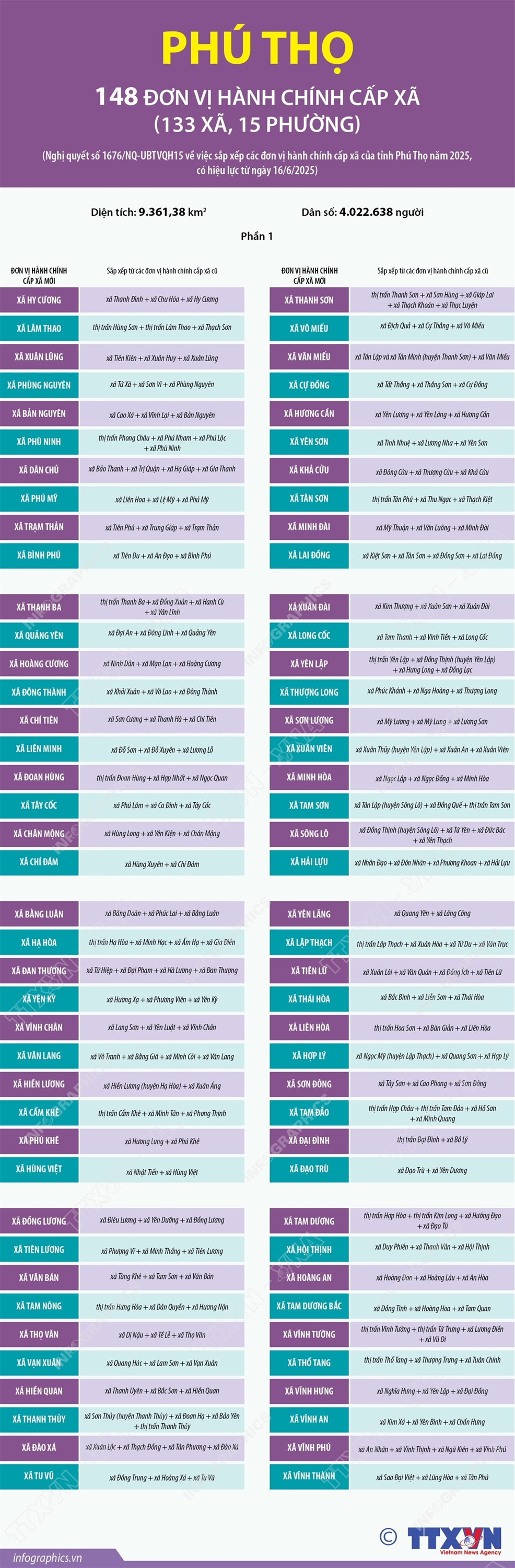 Phổ biến giáo dục Pháp luậtThông tin đồ họa Thông tin chi tiết sắp xếp các đơn vị hành chính cấp xã của tỉnh Phú Thọ (Phần 1) Thứ sáu, 04/07/2025 10:57 Hà Nội (TTXVN 4/7) Theo Nghị quyết số 1676/NQ-UBTVQH15 ngày 16/6/2025 của Ủy ban Thường vụ Quốc hội, sau khi sắp xếp, tỉnh Phú Thọ có 148 đơn vị hành chính cấp xã, gồm 133 xã và 15 phường; trong đó có 131 xã, 15 phường hình thành sau sắp xếp quy định tại Điều này và 02 xã không thực hiện sắp xếp là xã Thu Cúc, xã Trung Sơn.