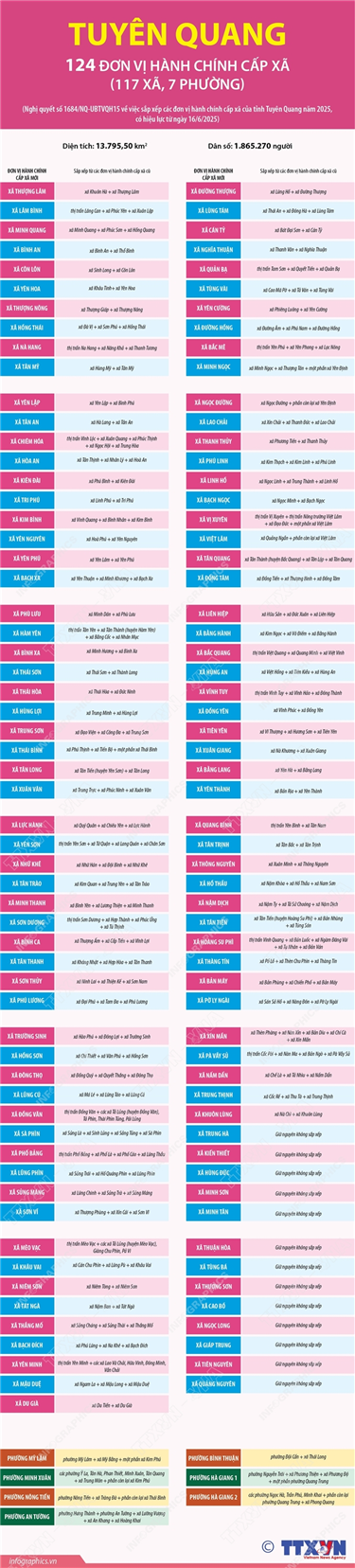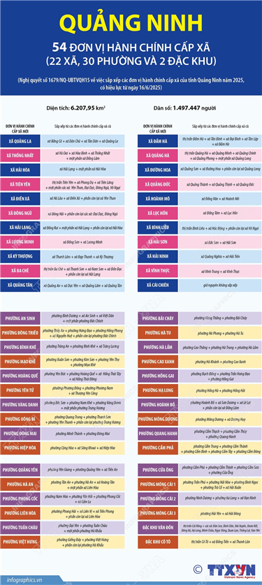 Tin cùng chuyên mục Thông tin chi tiết sắp xếp các đơn vị hành chính cấp xã của tỉnh Thanh Hóa (Phần 1)04/07/2025 10:58Hà Nội (TTXVN 4/7) Theo Nghị quyết số 1686/NQ-UBTVQH15 ngày 16/6/2025 của Ủy ban Thường vụ Quốc hội, sau khi sắp xếp, tỉnh Thanh Hóa có 166 đơn vị hành chính cấp xã, gồm 147 xã và 19 phường; trong đó có 126 xã, 19 phường hình thành sau sắp... Thông tin chi tiết sắp xếp các đơn vị hành chính cấp xã của tỉnh Phú Thọ (Phần 1)04/07/2025 10:57Hà Nội (TTXVN 4/7) Theo Nghị quyết số 1676/NQ-UBTVQH15 ngày 16/6/2025 của Ủy ban Thường vụ Quốc hội, sau khi sắp xếp, tỉnh Phú Thọ có 148 đơn vị hành chính cấp xã, gồm 133 xã và 15 phường; trong đó có 131 xã, 15 phường hình thành sau sắp xếp... Thông tin chi tiết sắp xếp các đơn vị hành chính cấp xã của tỉnh Phú Thọ (Phần 2)04/07/2025 10:57Hà Nội (TTXVN 4/7) Theo Nghị quyết số 1676/NQ-UBTVQH15 ngày 16/6/2025 của Ủy ban Thường vụ Quốc hội, sau khi sắp xếp, tỉnh Phú Thọ có 148 đơn vị hành chính cấp xã, gồm 133 xã và 15 phường; trong đó có 131 xã, 15 phường hình thành sau sắp xếp... Thông tin chi tiết sắp xếp các đơn vị hành chính cấp xã của tỉnh Quảng Ngãi04/07/2025 10:55Hà Nội (TTXVN 4/7) Theo Nghị quyết số 1677/NQ-UBTVQH15 ngày 16/6/2025 của Ủy ban Thường vụ Quốc hội, sau khi sắp xếp, tỉnh Quảng Ngãi có 96 đơn vị hành chính cấp xã, gồm 86 xã, 09 phường và 01 đặc khu; trong đó có 81 xã, 09 phường, 01 đặc khu hình... Thông tin chi tiết sắp xếp các đơn vị hành chính cấp xã của tỉnh Quảng Ninh04/07/2025 10:50Hà Nội (TTXVN 4/7) Theo Nghị quyết số 1679 /NQ-UBTVQH15 ngày 16/6/2025 của Ủy ban Thường vụ Quốc hội, sau khi sắp xếp, tỉnh Quảng Ninh có 54 đơn vị hành chính cấp xã, gồm 22 xã, 30 phường và 2 đặc khu. Thông tin chi tiết sắp xếp các đơn vị hành chính cấp xã của tỉnh Tuyên Quang04/07/2025 10:45Hà Nội (TTXVN 4/7) Theo Nghị quyết số 1684/NQ-UBTVQH15 ngày 16/6/2025 của Ủy ban Thường vụ Quốc hội, sau khi sắp xếp, tỉnh Tuyên Quang có 124 đơn vị hành chính cấp xã, gồm 117 xã và 7 phường.