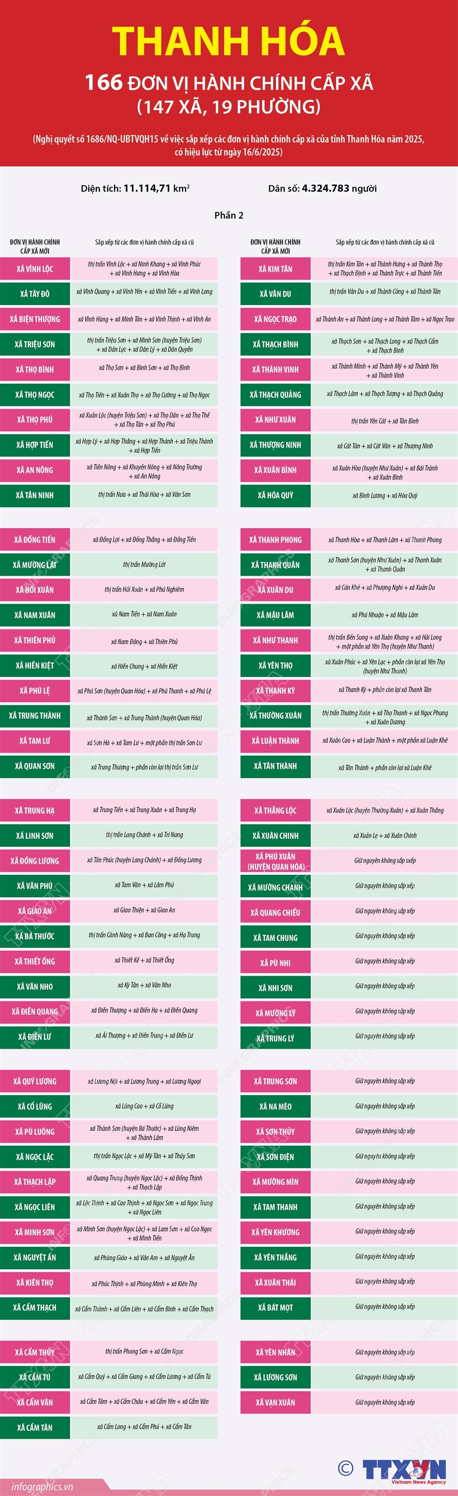 Phổ biến giáo dục Pháp luậtThông tin đồ họa Thông tin chi tiết sắp xếp các đơn vị hành chính cấp xã của tỉnh Thanh Hóa (Phần 2) Thứ sáu, 04/07/2025 10:59 Hà Nội (TTXVN 4/7) Theo Nghị quyết số 1686/NQ-UBTVQH15 ngày 16/6/2025 của Ủy ban Thường vụ Quốc hội, sau khi sắp xếp, tỉnh Thanh Hóa có 166 đơn vị hành chính cấp xã, gồm 147 xã và 19 phường; trong đó có 126 xã, 19 phường hình thành sau sắp xếp quy định tại Điều này và 21 xã không thực hiện sắp xếp là các xã Phú Xuân (huyện Quan Hóa), Mường Chanh, Quang Chiểu, Tam Chung, Pù Nhi, Nhi Sơn, Mường Lý, Trung Lý, Trung Sơn, Na Mèo, Sơn Thủy, Sơn Điện, Mường Mìn, Tam Thanh, Yên Khương, Yên Thắng, Xuân Thái, Bát Mọt, Yên Nhân, Lương Sơn, Vạn Xuân.