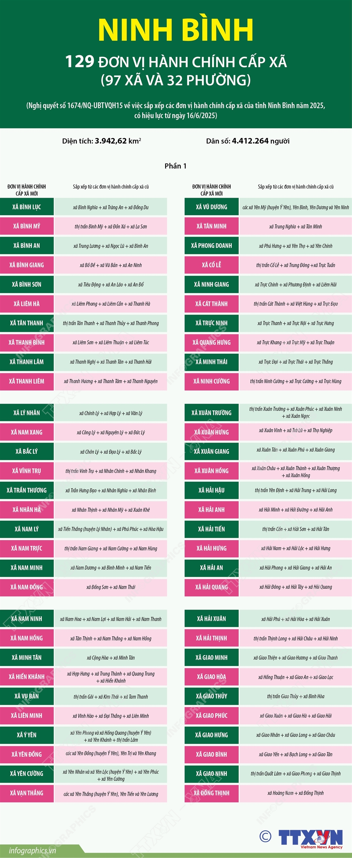 Phổ biến giáo dục Pháp luậtThông tin đồ họa Thông tin chi tiết sắp xếp các đơn vị hành chính cấp xã của tỉnh Ninh Bình (Phần 1) Thứ sáu, 04/07/2025 11:00 Hà Nội (TTXVN 4/7) Theo Nghị quyết số 1674/NQ-UBTVQH15 ngày 16/6/2025 của Ủy ban Thường vụ Quốc hội, sau khi sắp xếp, tỉnh Ninh Bình có 129 đơn vị hành chính cấp xã gồm 97 xã và 32 phường.