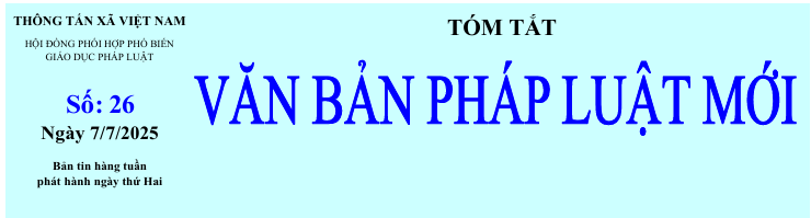 Phổ biến giáo dục Pháp luậtBản tin văn bản Pháp luật Tóm tắt Văn bản pháp luật mới: số 26 ngày 07/7/2025 của Hội đồng phối hợp Phổ biến giáo dục pháp luật TTXVN Thứ ba, 08/07/2025 08:58 Phòng Tổng hợp - Kiểm tra - Pháp chếThường trực Hội đồng phối hợp Phổ biến, giáo dục pháp luật TTXVN
