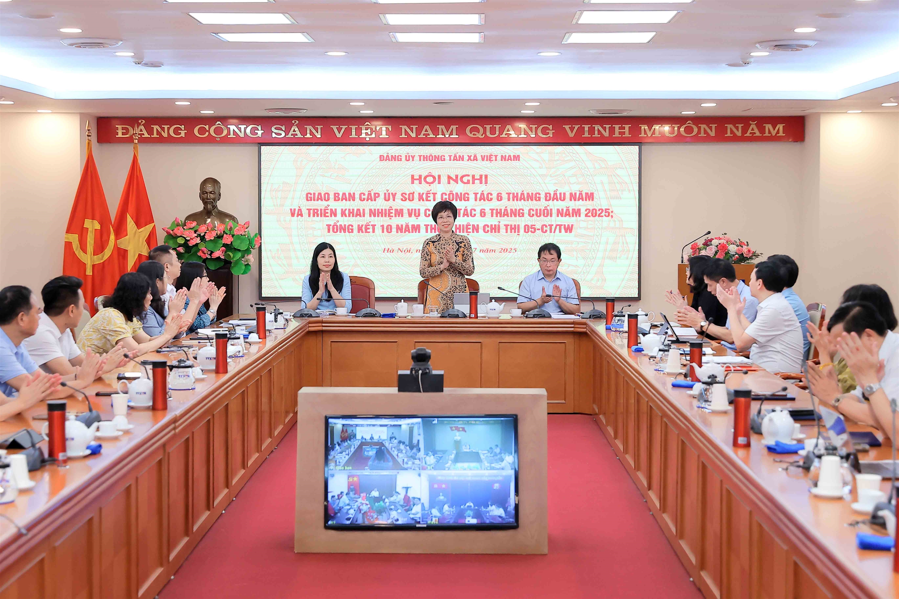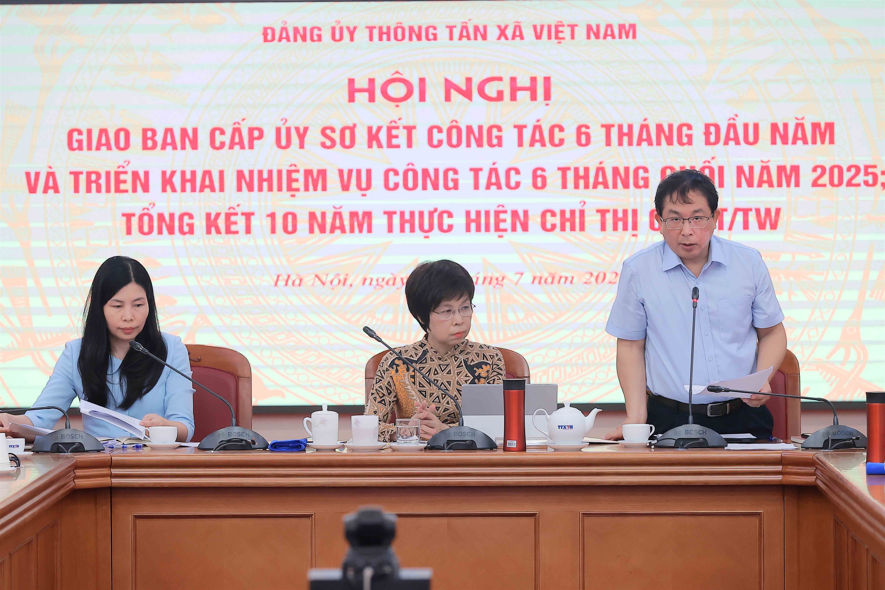 Trình bày báo cáo tóm tắt công tác 6 tháng đầu năm, Bí thư Đảng uỷ Vũ Việt Trang cho biết: dưới sự lãnh đạo, chỉ đạo sát sao, sự quan tâm, động viên kịp thời của Đảng ủy và Ban Lãnh đạo TTXVN, toàn Ngành đã nỗ lực phấn đấu hoàn thành tốt mọi nhiệm vụ chính trị được giao, giữ vững dòng thông tin chủ lực của cơ quan thông tấn quốc gia. Đảng ủy TTXVN chỉ đạo tổ chức thành công đại hội các tổ chức đảng trực thuộc; tích cực chuẩn bị tổ chức Đại hội đại biểu Đảng bộ TTXVN lần thứ XXVII, nhiệm kỳ 2025-2030.
