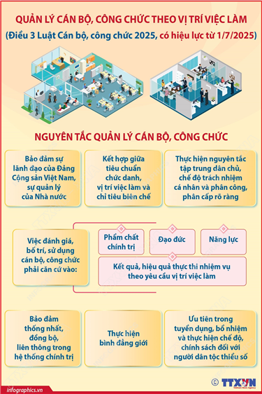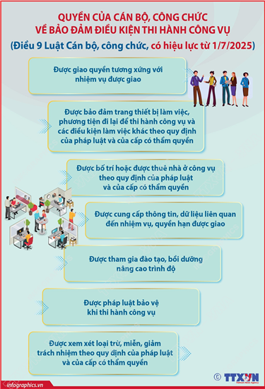 Tin cùng chuyên mục Mức án của 41 bị cáo trong vụ án xảy ra tại Công ty cổ phần Tập đoàn Phúc Sơn (phần 1)14/07/2025 10:46Hà Nội (TTXVN 11/7) Sau 17 ngày xét xử và nghị án, sáng 11/7/2024, Tòa án nhân dân thành phố Hà Nội đã tuyên án đối với 41 bị cáo trong vụ án xảy ra tại Công ty cổ phần Tập đoàn Phúc Sơn (Tập đoàn... Những việc cán bộ, công chức không được làm11/07/2025 10:43Hà Nội (TTXVN 11/7) Luật Cán bộ, công chức số 80/2025/QH15 của Quốc hội được thông qua ngày 25/6/2025 và chính thức có hiệu lực từ 1/7/2025. Điều 14 Luật Cán bộ, công chức quy định những việc cán bộ công chức không được làm như: Trốn tránh,... Xếp loại chất lượng công chức theo 4 mức11/07/2025 10:42Hà Nội (TTXVN 11/7) Căn cứ vào kết quả theo dõi, đánh giá, công chức được xếp loại chất lượng hằng năm theo 4 mức: Hoàn thành xuất sắc nhiệm vụ; hoàn thành tốt nhiệm vụ; hoàn thành nhiệm vụ và không hoàn thành nhiệm vụ. Kết quả xếp loại... Quyền của cán bộ, công chức về bảo đảm điều kiện thi hành công vụ11/07/2025 10:39Hà Nội (TTXVN 11/7) Điều 9 Luật Cán bộ, công chức quy định quyền của cán bộ, công chức về bảo đảm điều kiện thi hành công vụ: Được giao quyền tương xứng với nhiệm vụ được giao, Được bảo đảm trang thiết bị làm việc, phương tiện đi lại để thi hành công vụ và các điều... Quản lý cán bộ, công chức theo vị trí việc làm11/07/2025 10:38Hà Nội (TTXVN 11/7) Luật Cán bộ, công chức số 80/2025/QH15 của Quốc hội được thông qua ngày 25/6/2025 và chính thức có hiệu lực từ 1/7/2025. Tại Điều 3 Luật Cán bộ, công chức 2025 quy định nguyên tắc quản lý cán bộ, công chức: Bảo đảm sự lãnh đạo... Thành phố Hà Nội: Hơn 3.000 tỷ đồng hỗ trợ bữa ăn bán trú cho học sinh tiểu học10/07/2025 10:33Hà Nội (TTXVN 10/7) Chiều 9/7/2025, HĐND thành phố Hà Nội khóa XVI đã thông qua Nghị quyết quy định cơ chế hỗ trợ bữa ăn bán trú cho học sinh tiểu học trên địa bàn TP Hà Nội năm học 2025-2026. Thời gian hỗ trợ trong năm học 2025-2026, tính theo số ngày ăn...