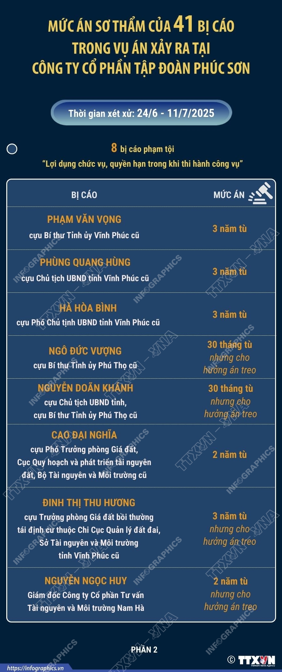 Phổ biến giáo dục Pháp luậtThông tin đồ họa Mức án của 41 bị cáo trong vụ án xảy ra tại Công ty cổ phần Tập đoàn Phúc Sơn (phần 2) Thứ hai, 14/07/2025 10:47 Hà Nội (TTXVN 11/7) Sau 17 ngày xét xử và nghị án, sáng 11/7/2024, Tòa án nhân dân thành phố Hà Nội đã tuyên án đối với 41 bị cáo trong vụ án xảy ra tại Công ty cổ phần Tập đoàn Phúc Sơn (Tập đoàn Phúc Sơn). Tòa đã tuyên án phạt bị cáo Nguyễn Văn Hậu (Chủ tịch Hội đồng quản trị, Tổng Giám đốc Tập đoàn Phúc Sơn) 14 năm tù về tội “Đưa hối lộ”; 9 năm tù về tội “Vi phạm quy định về đấu thầu gây hậu quả nghiêm trọng”; 7 năm tù về tội “Vi phạm quy định về kế toán gây hậu quả nghiêm trọng”. Tổng hợp hình phạt chung của 3 tội đối với bị cáo Hậu là 30 năm tù. Có 9 bị cáo bị phạt tù về tội “Nhận hối lộ”; 8 bị cáo phạm tội “Lợi dụng chức vụ, quyền hạn trong khi thi hành công vụ”; 17 bị cáo phạm tội “Vi phạm quy định về đấu thầu gây hậu quả nghiêm trọng”; 5 bị cáo phạm tội “Vi phạm quy định về kế toán gây hậu quả nghiêm trọng”. Riêng bị cáo Đặng Trung Hoành (cựu Chánh Văn phòng Huyện ủy Mang Thít, Vĩnh Long cũ) bị tuyên phạt 30 tháng tù về tội “Lợi dụng ảnh hưởng đối với người có chức vụ, quyền hạn để trục lợi”.