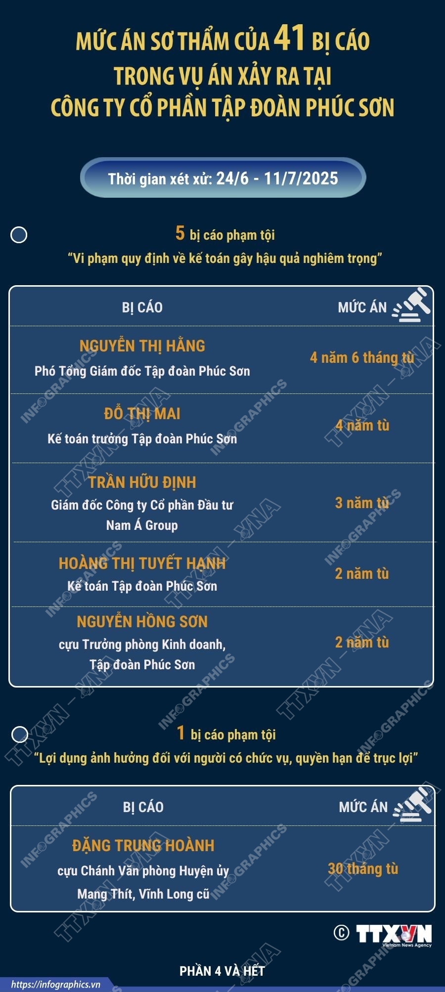 Phổ biến giáo dục Pháp luậtThông tin đồ họa Mức án của 41 bị cáo trong vụ án xảy ra tại Công ty cổ phần Tập đoàn Phúc Sơn (phần 4 và hết) Thứ hai, 14/07/2025 10:49 Hà Nội (TTXVN 11/7) Sau 17 ngày xét xử và nghị án, sáng 11/7/2024, Tòa án nhân dân thành phố Hà Nội đã tuyên án đối với 41 bị cáo trong vụ án xảy ra tại Công ty cổ phần Tập đoàn Phúc Sơn (Tập đoàn Phúc Sơn).Tòa đã tuyên án phạt bị cáo Nguyễn Văn Hậu (Chủ tịch Hội đồng quản trị, Tổng Giám đốc Tập đoàn Phúc Sơn) 14 năm tù về tội “Đưa hối lộ”; 9 năm tù về tội “Vi phạm quy định về đấu thầu gây hậu quả nghiêm trọng”; 7 năm tù về tội “Vi phạm quy định về kế toán gây hậu quả nghiêm trọng”. Tổng hợp hình phạt chung của 3 tội đối với bị cáo Hậu là 30 năm tù. Có 9 bị cáo bị phạt tù về tội “Nhận hối lộ”; 8 bị cáo phạm tội “Lợi dụng chức vụ, quyền hạn trong khi thi hành công vụ”; 17 bị cáo phạm tội “Vi phạm quy định về đấu thầu gây hậu quả nghiêm trọng”; 5 bị cáo phạm tội “Vi phạm quy định về kế toán gây hậu quả nghiêm trọng”. Riêng bị cáo Đặng Trung Hoành (cựu Chánh Văn phòng Huyện ủy Mang Thít, Vĩnh Long cũ) bị tuyên phạt 30 tháng tù về tội “Lợi dụng ảnh hưởng đối với người có chức vụ, quyền hạn để trục lợi”.