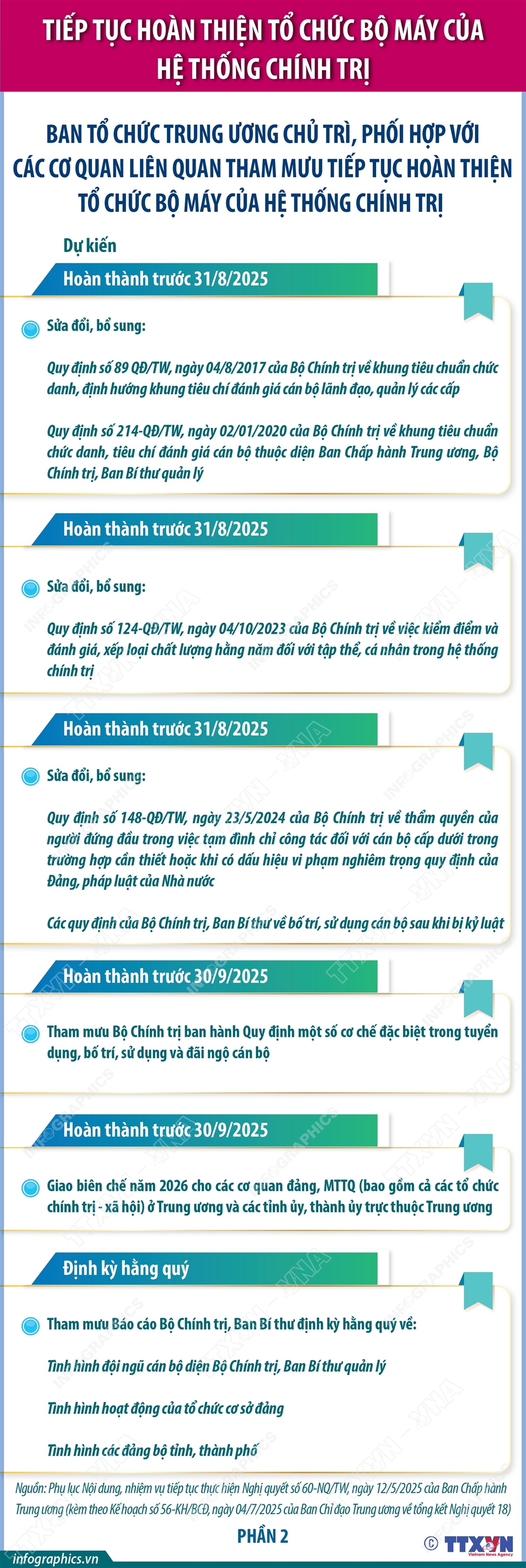 Phổ biến giáo dục Pháp luậtThông tin đồ họa Ban Tổ chức Trung ương chủ trì phối hợp với các cơ quan liên quan tham mưu tiếp tục hoàn thiện bộ máy của tổ chức chính trị (phần 2) Thứ hai, 14/07/2025 10:52 Hà Nội (TTXVN 11/7) Thực hiện Nghị quyết số 60-NQ/TW, ngày 12/4/2025 của Ban Chấp hành Trung ương Đảng khóa XIII về tiếp tục sắp xếp tổ chức bộ máy của hệ thống chính trị và các kết luận của Bộ Chính trị, Ban Bí thư; Ban Chỉ đạo Trung ương về tổng kết Nghị quyết 18 ban hành Kế hoạch 56-KH/BCĐ ngày 4/7/2025 tiếp tục hoàn thiện tổ chức bộ máy của hệ thống chính trị và chuẩn bị Đại hội đảng bộ các cấp. Dưới đây là các nhiệm vụ cụ thể của Ban Tổ chức Trung ương trong việc chủ trì phối hợp với các cơ quan liên quan tham mưu tiếp tục hoàn thiện bộ máy của tổ chức chính trị.