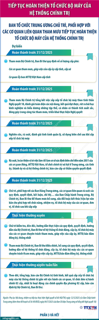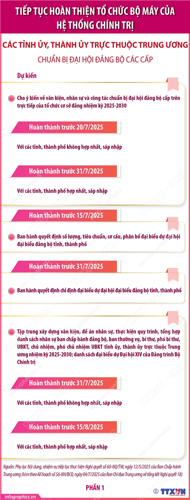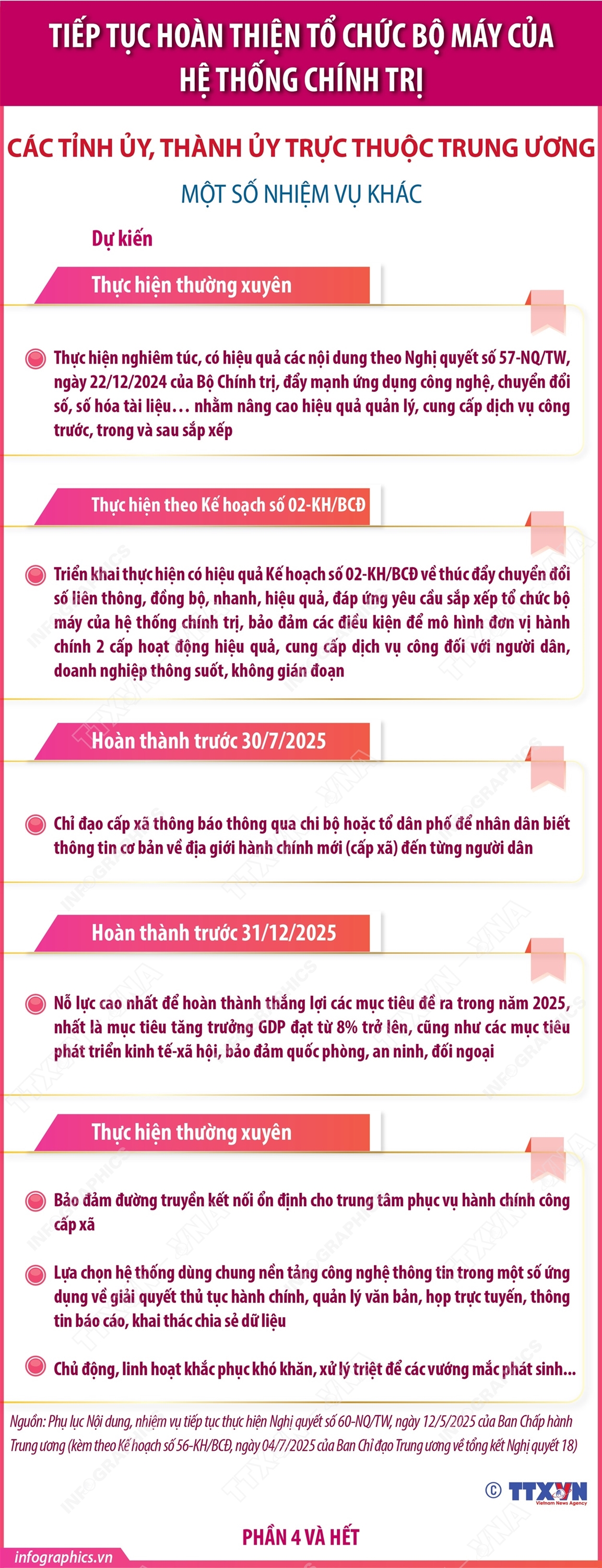 Phổ biến giáo dục Pháp luậtThông tin đồ họa Các tỉnh ủy, thành ủy Trung ương tiếp tục hoàn thiện bộ máy của tổ chức chính trị (phần 4 và hết) Thứ hai, 14/07/2025 14:06 Hà Nội (TTXVN 12/7) Thực hiện Nghị quyết số 60-NQ/TW, ngày 12/4/2025 của Ban Chấp hành Trung ương Đảng khóa XIII về tiếp tục sắp xếp tổ chức bộ máy của hệ thống chính trị và các kết luận của Bộ Chính trị, Ban Bí thư; Ban Chỉ đạo Trung ương về tổng kết Nghị quyết 18 ban hành Kế hoạch 56-KH/BCĐ ngày 4/7/2025 tiếp tục hoàn thiện tổ chức bộ máy của hệ thống chính trị và chuẩn bị Đại hội đảng bộ các cấp. Dưới đây là các nhiệm vụ cụ thể của các tỉnh ủy, thành ủy Trung ương để tiếp tục hoàn thiện tổ chức bộ máy của hệ thống chính trị.