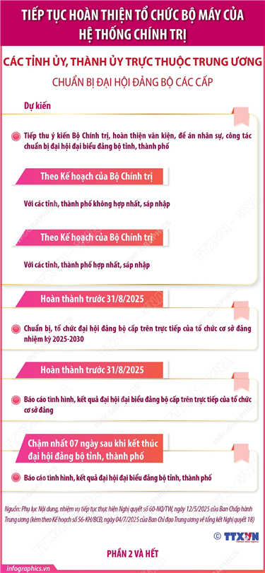 Tin cùng chuyên mục Kết luận số 177-KL/TW: Bộ Chính trị, Ban Bí thư yêu cầu cấp ủy, tổ chức đảng trực thuộc Trung ương, các bộ, ngành14/07/2025 14:07Hà Nội (TTXVN 12/7) Tại Kết luận số 177-KL/TW, ngày 11/7/2025 về tiếp tục xây dựng tổ chức, hoạt động của đơn vị hành chính 2 cấp bảo đảm thông suốt, hiệu quả, Bộ Chính trị, Ban Bí thư yêu cầu cấp ủy, tổ chức đảng trực thuộc Trung ương, các bộ, ngành phải triển khai quyết... Các tỉnh ủy, thành ủy Trung ương tiếp tục hoàn thiện bộ máy của tổ chức chính trị (phần 4 và hết)14/07/2025 14:06Hà Nội (TTXVN 12/7) Thực hiện Nghị quyết số 60-NQ/TW, ngày 12/4/2025 của Ban Chấp hành Trung ương Đảng khóa XIII về tiếp tục sắp xếp tổ chức bộ máy của hệ thống chính trị và các kết luận của Bộ Chính trị, Ban Bí thư; Ban Chỉ đạo Trung ương về tổng kết Nghị quyết 18 ban... Các tỉnh ủy, thành ủy Trung ương tiếp tục hoàn thiện bộ máy của tổ chức chính trị (phần 3)14/07/2025 14:05Hà Nội (TTXVN 12/7) Thực hiện Nghị quyết số 60-NQ/TW, ngày 12/4/2025 của Ban Chấp hành Trung ương Đảng khóa XIII về tiếp tục sắp xếp tổ chức bộ máy của hệ thống chính trị và các kết luận của Bộ Chính trị, Ban Bí thư; Ban Chỉ đạo Trung ương về tổng kết Nghị quyết 18 ban... Các tỉnh ủy, thành ủy Trung ương tiếp tục hoàn thiện bộ máy của tổ chức chính trị (phần 1)14/07/2025 11:02Hà Nội (TTXVN 12/7) Thực hiện Nghị quyết số 60-NQ/TW, ngày 12/4/2025 của Ban Chấp hành Trung ương Đảng khóa XIII về tiếp tục sắp xếp tổ chức bộ máy của hệ thống chính trị và các kết luận của Bộ Chính trị, Ban Bí thư; Ban Chỉ đạo Trung ương về tổng kết Nghị quyết 18 ban... Các tỉnh ủy, thành ủy Trung ương tiếp tục hoàn thiện bộ máy của tổ chức chính trị (phần 2)14/07/2025 11:02Hà Nội (TTXVN 12/7) Thực hiện Nghị quyết số 60-NQ/TW, ngày 12/4/2025 của Ban Chấp hành Trung ương Đảng khóa XIII về tiếp tục sắp xếp tổ chức bộ máy của hệ thống chính trị và các kết luận của Bộ Chính trị, Ban Bí thư; Ban Chỉ đạo Trung ương về tổng kết Nghị quyết 18 ban... Các tỉnh ủy, thành ủy Trung ương chuẩn bị cho đại hội đảng bộ các cấp (phần 2 và hết)14/07/2025 11:01Hà Nội (TTXVN 12/7) Thực hiện Nghị quyết số 60-NQ/TW, ngày 12/4/2025 của Ban Chấp hành Trung ương Đảng khóa XIII về tiếp tục sắp xếp tổ chức bộ máy của hệ thống chính trị và các kết luận của Bộ Chính trị, Ban Bí thư; Ban Chỉ đạo Trung ương về tổng kết Nghị quyết 18 ban...
