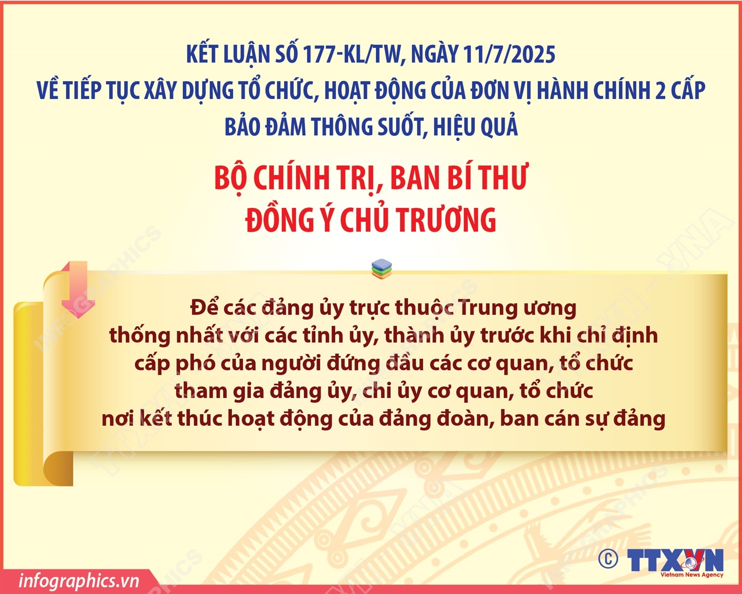 Phổ biến giáo dục Pháp luậtThông tin đồ họa Kết luận 177-KL/TW: Các đảng ủy trực thuộc Trung ương thống nhất với các tỉnh ủy, thành ủy trước khi chỉ định cấp phó của người đứng đầu các cơ quan, tổ chức tham gia đảng ủy, chi ủy cơ quan, tổ chức nơi kết thúc hoạt động của đảng đoàn, ban cán sự đảng Thứ hai, 14/07/2025 14:09 Hà Nội (TTXVN 13/7) Tại Kết luận 177-KL/TW ngày 11/7/2025, Bộ Chính trị, Ban Bí thư đồng ý chủ trương để các đảng ủy trực thuộc Trung ương thống nhất với các tỉnh ủy, thành ủy trước khi chỉ định cấp phó của người đứng đầu các cơ quan, tổ chức tham gia đảng ủy, chi ủy cơ quan, tổ chức nơi kết thúc hoạt động của đảng đoàn, ban cán sự đảng.