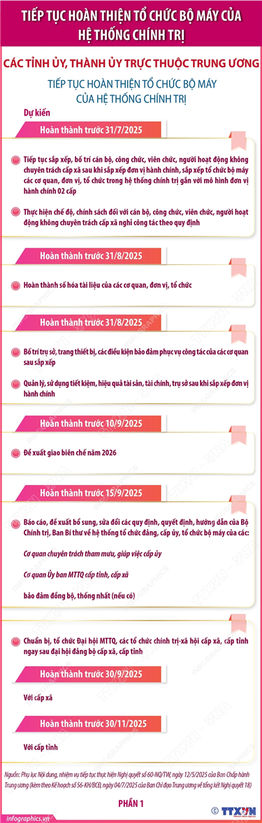 Tin cùng chuyên mục Kết luận số 177-KL/TW: Các nhiệm vụ của ban thường vụ các tỉnh ủy, thành ủy14/07/2025 14:10Hà Nội (TTXVN 13/7) Tại Kết luận số 177-KL/TW ngày 11/7/2025, Bộ Chính trị, Ban Bí thư yêu cầu ban thường vụ các tỉnh ủy, thành ủy lãnh đạo, chỉ đạo thành lập mới 2 đảng bộ (chi bộ) cơ quan trực thuộc cấp ủy cấp xã; thực hiện thống nhất chủ trương đồng chí bí thư... Kết luận 177-KL/TW: Các đảng ủy trực thuộc Trung ương thống nhất với các tỉnh ủy, thành ủy trước khi chỉ định cấp phó của người đứng đầu các cơ quan, tổ chức tham gia đảng ủy, chi ủy cơ quan, tổ chức nơi kết thúc hoạt động của đảng đoàn, ban cán sự đảng14/07/2025 14:09Hà Nội (TTXVN 13/7) Tại Kết luận 177-KL/TW ngày 11/7/2025, Bộ Chính trị, Ban Bí thư đồng ý chủ trương để các đảng ủy trực thuộc Trung ương thống nhất với các tỉnh ủy, thành ủy trước khi chỉ định cấp phó của người đứng đầu các cơ quan, tổ chức tham gia đảng ủy, chi ủy cơ quan,... Kết luận số 177-KL/TW: Bộ Chính trị, Ban Bí thư yêu cầu cấp ủy, tổ chức đảng trực thuộc Trung ương, các bộ, ngành14/07/2025 14:07Hà Nội (TTXVN 12/7) Tại Kết luận số 177-KL/TW, ngày 11/7/2025 về tiếp tục xây dựng tổ chức, hoạt động của đơn vị hành chính 2 cấp bảo đảm thông suốt, hiệu quả, Bộ Chính trị, Ban Bí thư yêu cầu cấp ủy, tổ chức đảng trực thuộc Trung ương, các bộ, ngành phải triển khai quyết... Các tỉnh ủy, thành ủy Trung ương tiếp tục hoàn thiện bộ máy của tổ chức chính trị (phần 4 và hết)14/07/2025 14:06Hà Nội (TTXVN 12/7) Thực hiện Nghị quyết số 60-NQ/TW, ngày 12/4/2025 của Ban Chấp hành Trung ương Đảng khóa XIII về tiếp tục sắp xếp tổ chức bộ máy của hệ thống chính trị và các kết luận của Bộ Chính trị, Ban Bí thư; Ban Chỉ đạo Trung ương về tổng kết Nghị quyết 18 ban... Các tỉnh ủy, thành ủy Trung ương tiếp tục hoàn thiện bộ máy của tổ chức chính trị (phần 3)14/07/2025 14:05Hà Nội (TTXVN 12/7) Thực hiện Nghị quyết số 60-NQ/TW, ngày 12/4/2025 của Ban Chấp hành Trung ương Đảng khóa XIII về tiếp tục sắp xếp tổ chức bộ máy của hệ thống chính trị và các kết luận của Bộ Chính trị, Ban Bí thư; Ban Chỉ đạo Trung ương về tổng kết Nghị quyết 18 ban... Các tỉnh ủy, thành ủy Trung ương tiếp tục hoàn thiện bộ máy của tổ chức chính trị (phần 1)14/07/2025 11:02Hà Nội (TTXVN 12/7) Thực hiện Nghị quyết số 60-NQ/TW, ngày 12/4/2025 của Ban Chấp hành Trung ương Đảng khóa XIII về tiếp tục sắp xếp tổ chức bộ máy của hệ thống chính trị và các kết luận của Bộ Chính trị, Ban Bí thư; Ban Chỉ đạo Trung ương về tổng kết Nghị quyết 18 ban...