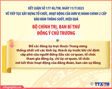 Tin cùng chuyên mục Kết luận 177-KL/TW: Các nhiệm vụ của Ban Tổ chức Trung ương14/07/2025 14:18Hà Nội (TTXVN 13/7) Tại Kết luận 177-KL/TW ngày 11/7/2025, Bộ Chính trị, Ban Bí thư giao Ban Tổ chức Trung ương: (1) Chủ trì, phối hợp với các cơ quan có liên quan tham mưu Bộ Chính trị, Ban Bí thư triển khai các nhiệm vụ về chuẩn bị Đại hội XIV của Đảng; ban hành... Kết luận 177-KL/TW: Các nhiệm vụ của các cơ quan, đơn vị của Đảng ở Trung ương14/07/2025 14:16Hà Nội (TTXVN 13/7) Tại Kết luận 177-KL/TW ngày 11/7/2025, Bộ Chính trị, Ban Bí thư giao các cơ quan, đơn vị của Đảng ở Trung ương chủ trì, phối hợp với các cơ quan có liên quan thường xuyên kiểm tra, hướng dẫn việc thực hiện các quy định, hướng dẫn của Trung ương trong... Kết luận số 177-KL/TW: Các nhiệm vụ của Đảng ủy Mặt trận Tổ quốc, các đoàn thể Trung ương14/07/2025 14:12Hà Nội (TTXVN 13/7) Tại Kết luận số 177-KL/TW ngày 11/7/2025, Bộ Chính trị, Ban Bí thư giao Đảng ủy Mặt trận Tổ quốc, các đoàn thể Trung ương lãnh đạo, chỉ đạo: (1) Tiếp tục chỉ đạo Trung ương Đoàn Thanh niên Cộng sản Hồ Chí Minh duy trì hoạt động tình nguyện đưa... Kết luận số 177-KL/TW: Các nhiệm vụ của Đảng ủy Chính phủ14/07/2025 14:11Hà Nội (TTXVN 13/7) Tại Kết luận số 177-KL/TW ngày 11/7/2025, Bộ Chính trị, Ban Bí thư giao Đảng ủy Chính phủ lãnh đạo, chỉ đạo việc triển khai thực hiện các nội dung, nhiệm vụ nêu tại Kế hoạch số 56-KH/BCĐ, ngày 4/7/2025 của Ban Chỉ đạo Kết luận số 177-KL/TW: Các nhiệm vụ của ban thường vụ các tỉnh ủy, thành ủy14/07/2025 14:10Hà Nội (TTXVN 13/7) Tại Kết luận số 177-KL/TW ngày 11/7/2025, Bộ Chính trị, Ban Bí thư yêu cầu ban thường vụ các tỉnh ủy, thành ủy lãnh đạo, chỉ đạo thành lập mới 2 đảng bộ (chi bộ) cơ quan trực thuộc cấp ủy cấp xã; thực hiện thống nhất chủ trương đồng chí bí thư... Kết luận 177-KL/TW: Các đảng ủy trực thuộc Trung ương thống nhất với các tỉnh ủy, thành ủy trước khi chỉ định cấp phó của người đứng đầu các cơ quan, tổ chức tham gia đảng ủy, chi ủy cơ quan, tổ chức nơi kết thúc hoạt động của đảng đoàn, ban cán sự đảng14/07/2025 14:09Hà Nội (TTXVN 13/7) Tại Kết luận 177-KL/TW ngày 11/7/2025, Bộ Chính trị, Ban Bí thư đồng ý chủ trương để các đảng ủy trực thuộc Trung ương thống nhất với các tỉnh ủy, thành ủy trước khi chỉ định cấp phó của người đứng đầu các cơ quan, tổ chức tham gia đảng ủy, chi ủy cơ quan,...