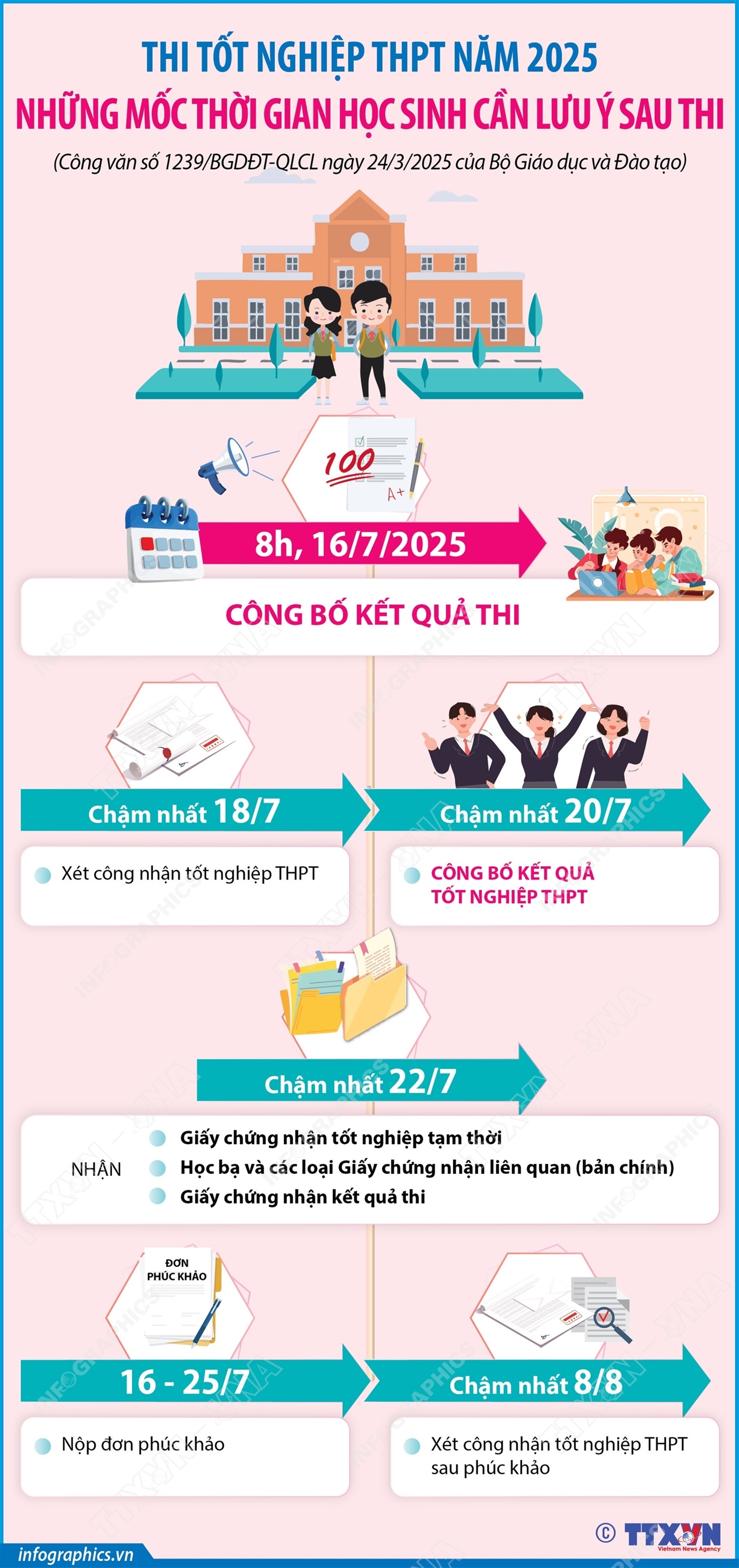 Phổ biến giáo dục Pháp luậtThông tin đồ họa Những mốc thời gian cần lưu ý sau thi tốt nghiệp THPT 2025 Thứ hai, 14/07/2025 14:19 Hà Nội (TTXVN 14/7) Điểm thi tốt nghiệp THPT năm 2025 sẽ được công bố vào 8 giờ ngày 16/7/2025. Sau khi điểm thi được công bố, thí sinh cần lưu ý những mốc thời gian quan trọng như: Thời gian nhận giấy chứng nhận kết quả thi tốt nghiệp THPT, nộp đơn phúc khảo (nếu có), nhận giấy chứng nhận kết quả thi, học bạ và các loại Giấy chứng nhận liên quan…