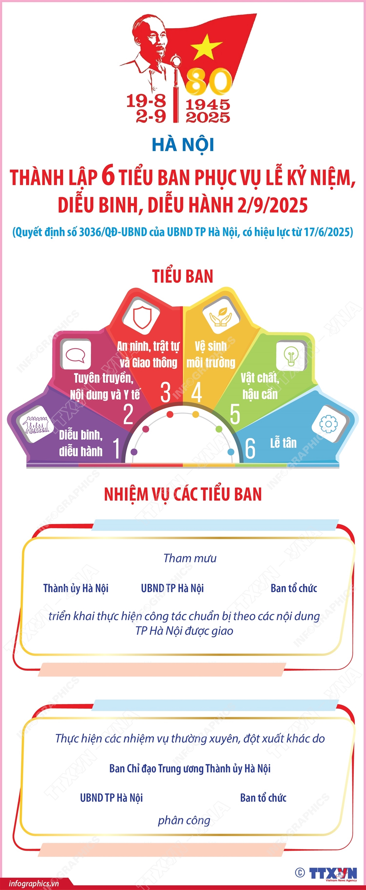 Phổ biến giáo dục Pháp luậtThông tin đồ họa Hà Nội thành lập 6 tiểu ban phục vụ lễ kỷ niệm, diễu binh, diễu hành 2/9/2025 Thứ năm, 17/07/2025 14:44 Hà Nội (TTXVN 17/7) Theo Quyết định số 3036/QĐ-UBND ngày 17/6/2025, UBND TP Hà Nội thành lập 6 tiểu ban giúp việc Ban tổ chức Lễ kỷ niệm, diễu binh, diễu hành kỷ niệm 80 năm Cách mạng Tháng Tám thành công (19/8/1945 - 19/8/2025) và Quốc khánh nước CHXHCN Việt Nam (2/9/1945 - 2/9/2025). Các tiểu ban gồm: Tiểu ban Diễu binh, diễu hành; Tiểu ban Tuyên truyền, Nội dung và Y tế; Tiểu ban An ninh, trật tự và Giao thông; Tiểu ban Vệ sinh môi trường; Tiểu ban Vật chất, hậu cần; Tiểu ban Lễ tân. Các tiểu ban có nhiệm vụ tham mưu Thành ủy, UBND thành phố, Ban tổ chức triển khai thực hiện công tác chuẩn bị Lễ kỷ niệm, diễu binh, diễu hành theo các nội dung TP Hà Nội được giao tại Đề án của Ban Chỉ đạo Trung ương và theo kế hoạch của UBND thành phố...