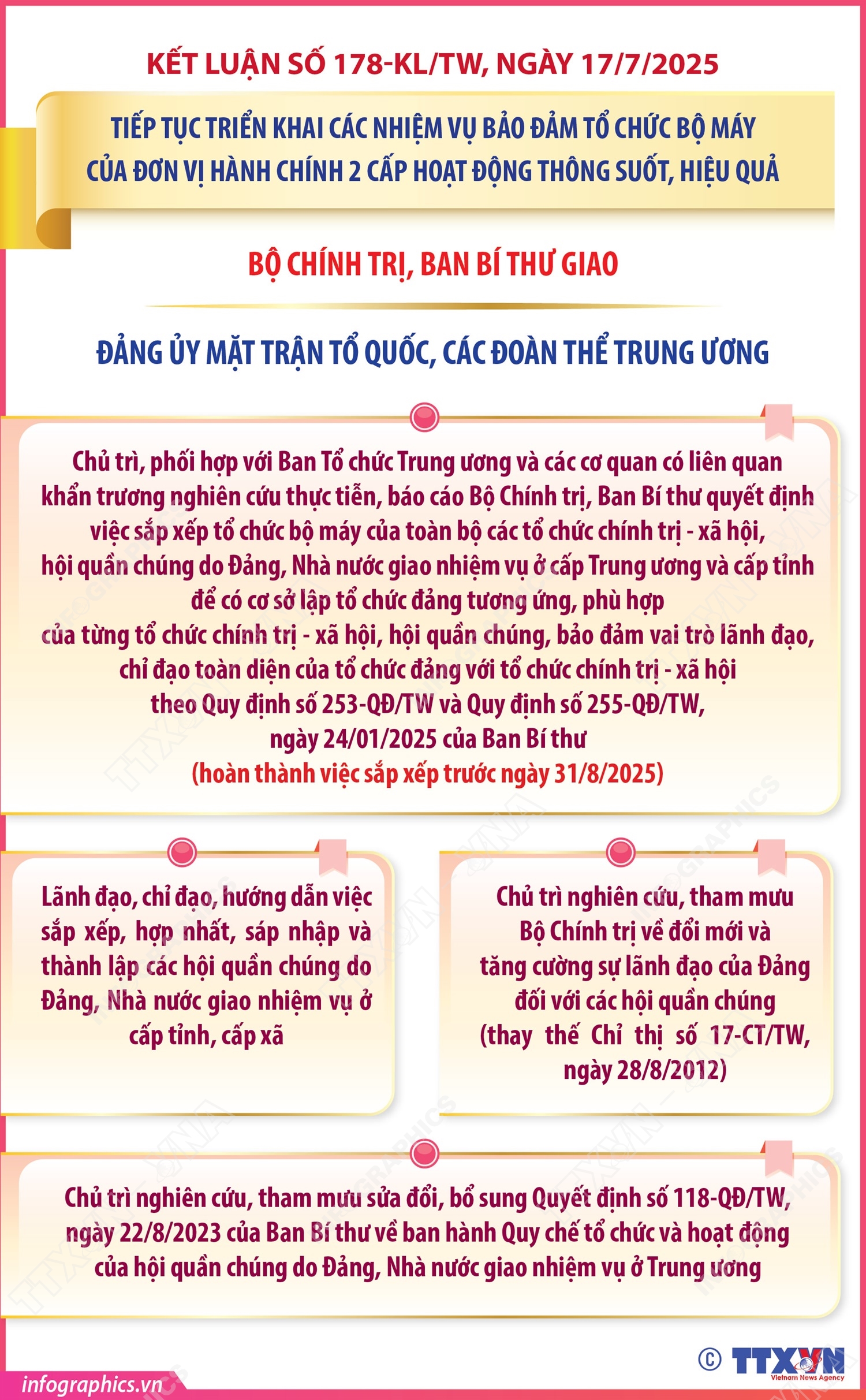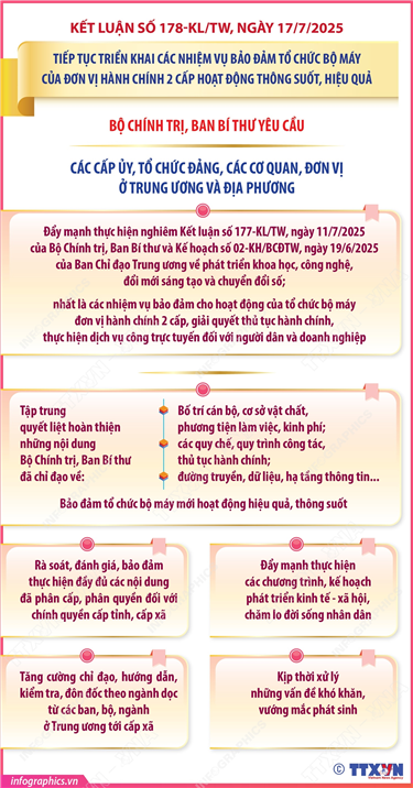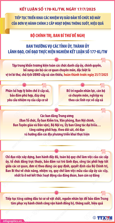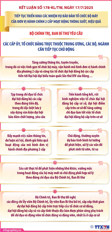 Phổ biến giáo dục Pháp luậtThông tin đồ họa Kết luận số 178-KL/TW: Các nhiệm vụ của Đảng ủy Mặt trận Tổ quốc, các đoàn thể Trung ương Thứ hai, 21/07/2025 08:55 Hà Nội (TTXVN 18/7) Ngày 17/7/2025, Ủy viên Bộ Chính trị, Thường trực Ban Bí thư Trần Cẩm Tú đã ký ban hành Kết luận số 178-KL/TW của Bộ Chính trị, Ban Bí thư về tiếp tục triển khai các nhiệm vụ bảo đảm tổ chức bộ máy của đơn vị hành chính 2 cấp hoạt động thông suốt, hiệu quả (gọi tắt là Kết luận số 178). Bộ Chính trị, Ban Bí thư giao Đảng uỷ Mặt trận Tổ quốc, các đoàn thể Trung ương chủ trì, phối hợp với Ban Tổ chức Trung ương và các cơ quan có liên quan khẩn trương nghiên cứu thực tiễn, báo cáo Bộ Chính trị, Ban Bí thư quyết định việc sắp xếp tổ chức bộ máy của toàn bộ các tổ chức chính trị - xã hội, hội quần chúng do Đảng, Nhà nước giao nhiệm vụ ở cấp Trung ương và cấp tỉnh để có cơ sở lập tổ chức đảng tương ứng, phù hợp của từng tổ chức chính trị - xã hội, hội quần chúng, bảo đảm vai trò lãnh đạo, chỉ đạo toàn diện của tổ chức đảng với tổ chức chính trị - xã hội…