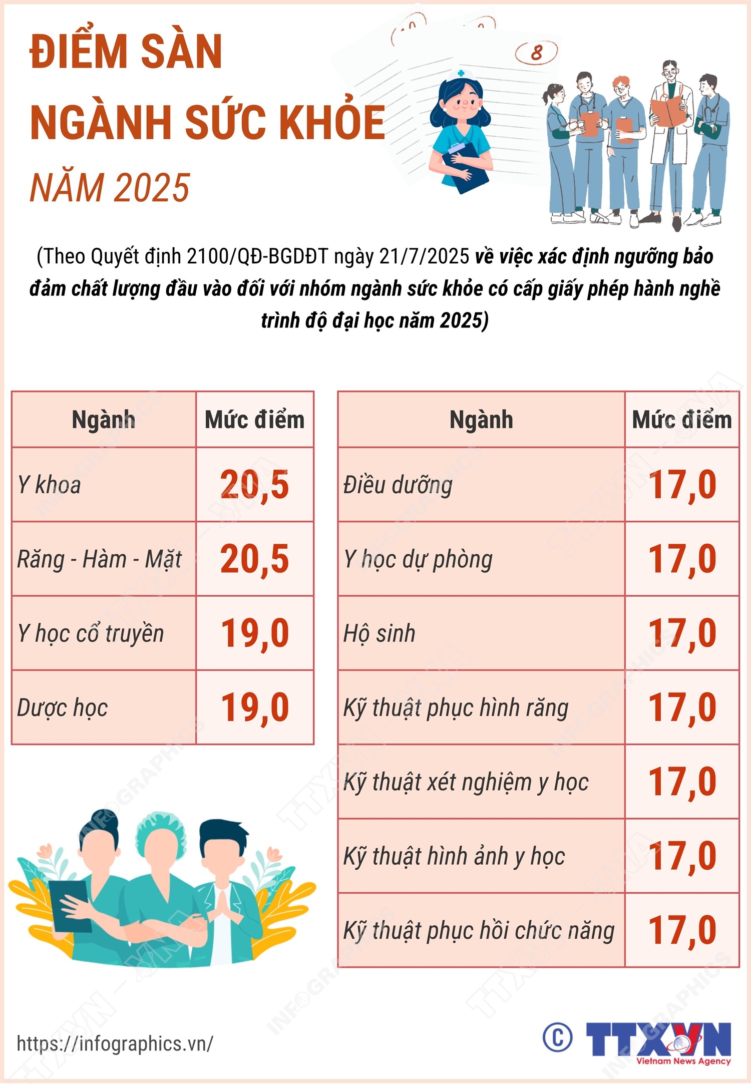 Phổ biến giáo dục Pháp luậtThông tin đồ họa Công bố điểm sàn ngành Sức khỏe năm 2025 Thứ tư, 23/07/2025 09:28 Hà Nội (TTXVN 23/7) Thứ trưởng Bộ Giáo dục và Đào tạo Hoàng Minh Sơn đã ký ban hành Quyết định số 2100/QĐ-BGDĐT về việc xác định ngưỡng bảo đảm chất lượng đầu vào (điểm sàn) đối với nhóm ngành sức khỏe có chứng chỉ hành nghề trình độ đại học năm 2025. Theo Quyết định, Ngưỡng bảo đảm chất lượng đầu vào từ điểm thi tốt nghiệp THPT để tuyển sinh các ngành thuộc nhóm ngành đào tạo giáo viên trình độ đại học, cao đẳng năm 2025 đối với thí sinh ở khu vực 3 có mức điểm tối thiểu (không nhân hệ số) của tất cả các tổ hợp gồm 3 bài thi/môn thi, không tính điểm cộng, không phân biệt kết quả thi của thí sinh học Chương trình giáo dục phổ thông 2006, 2018.