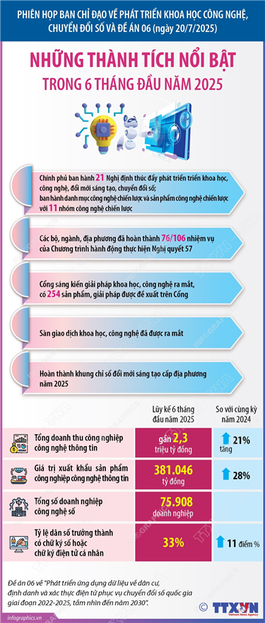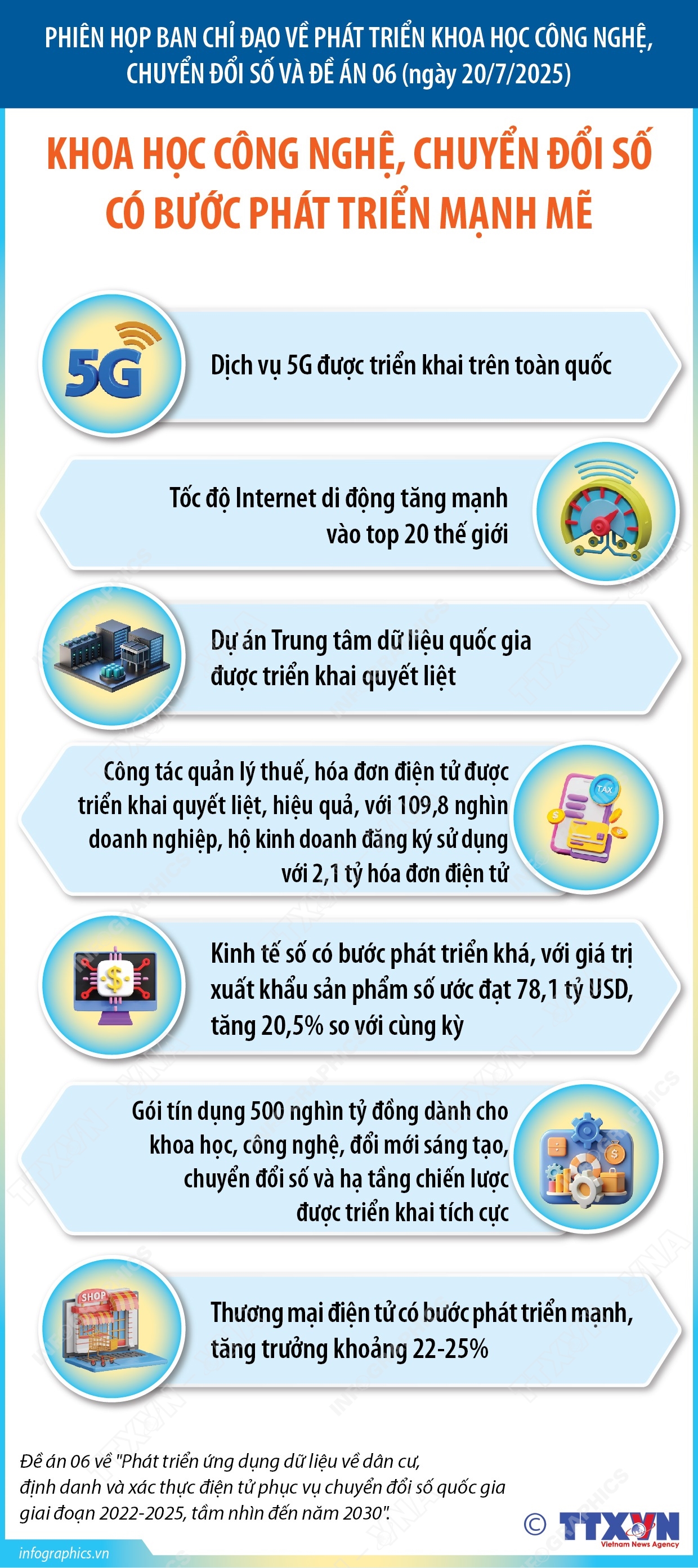 Phổ biến giáo dục Pháp luậtThông tin đồ họa Khoa học công nghệ, chuyển đổi số có bước phát triển mạnh mẽ Thứ năm, 24/07/2025 09:31 Hà Nội (TTXVN 23/7) Sáng 20/7/2025, Thủ tướng Chính phủ Phạm Minh Chính, Trưởng Ban Chỉ đạo của Chính phủ về phát triển khoa học, công nghệ, đổi mới sáng tạo, chuyển đổi số và đề án 06 (Ban Chỉ đạo), chủ trì Phiên họp thứ Ba của Ban Chỉ đạo để sơ kết công tác 6 tháng đầu năm, triển khai nhiệm vụ 6 tháng cuối năm 2025. Đánh giá kết quả đạt được thời gian qua, Thủ tướng cho rằng, công tác lãnh đạo, chỉ đạo điều hành được triển khai quyết liệt và được tổ chức thực hiện đồng bộ với quyết tâm cao từ Trung ương đến cơ sở. Cơ bản đã hoàn thiện về thể chế, cơ chế, chính sách tạo hành lang pháp lý cho khoa học, công nghệ, đổi mới sáng tạo, chuyển đổi số và Đề án 06. Khoa học, công nghệ, đổi mới sáng tạo, chuyển đổi số và phát triển kinh tế số có bước phát triển mạnh mẽ: dịch vụ 5G trên toàn quốc được triển khai toàn quốc; tốc độ Internet di động tăng mạnh vào top 20 thế giới; dự án Trung tâm dữ liệu quốc gia được triển khai quyết liệt.