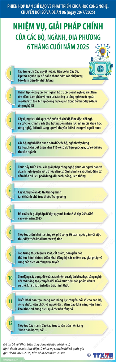 Tin cùng chuyên mục Mẫu logo chính thức sử dụng trong các hoạt động tuyên truyền Kỷ niệm 80 năm Cách mạng Tháng Tám và Quốc khánh 2/925/07/2025 09:34Hà Nội (TTXVN 25/7) Bộ Văn hóa, Thể thao và Du lịch đã ban hành Quyết định số 2305/QĐ-BVHTTDL ngày 2/7/2025 phê duyệt mẫu biểu trưng (logo) để sử dụng chính thức trong các hoạt động tuyên truyền kỷ niệm 80 năm Cách mạng tháng Tám thành công... Đến năm 2030: Hà Nội phấn đấu kinh tế tư nhân đóng góp 55-60% GRDP25/07/2025 09:33Hà Nội (TTXVN 25/7) Theo Kế hoạch hành động số 348-KH/TU của Thành ủy Hà Nội ngày 3/7/2025 thực hiện Nghị quyết số 68-NQ/TW ngày 4/5/2025 của Bộ Chính trị về phát triển kinh tế tư nhân, TP Hà Nội đặt quyết tâm đến năm 2030 đưa khu vực kinh tế tư nhân chiếm tỷ trọng... Hà Tĩnh: Tai nạn giao thông đặc biệt nghiêm trọng, 10 người tử vong25/07/2025 09:16Hà Nội (TTXVN 25/7) Vụ tai nạn giao thông đặc biệt nghiêm trọng trên quốc lộ 1A thuộc địa phận phường Sông Trí (tỉnh Hà Tĩnh) rạng sáng ngày 25/7/2025 đã làm 10 người tử vong và 15 người bị thương. Ngày 25/7, Thủ tướng Chính phủ Phạm Minh Chính... Truyền thống cao đẹp "Uống nước nhớ nguồn"24/07/2025 09:32Hà Nội (TTXVN 24/7) Bài viết "Uống nước nhớ nguồn", Tổng Bí thư Tô Lâm khẳng định: "Chúng ta không thể có ngày hôm nay, không thể có một Việt Nam đổi mới, phát triển, hội nhập sâu rộng nếu không có mồ hôi, máu xương của bao thế... Khoa học công nghệ, chuyển đổi số có bước phát triển mạnh mẽ24/07/2025 09:31Hà Nội (TTXVN 23/7) Sáng 20/7/2025, Thủ tướng Chính phủ Phạm Minh Chính, Trưởng Ban Chỉ đạo của Chính phủ về phát triển khoa học, công nghệ, đổi mới sáng tạo, chuyển đổi số và đề án 06 (Ban Chỉ đạo), chủ trì Phiên họp thứ Ba của Ban Chỉ đạo để sơ kết công... Nhiệm vụ, giải pháp chính của các bộ, ngành, địa phương về phát triển khoa học công nghệ, chuyển đổi số 6 tháng cuối năm 202524/07/2025 09:30Hà Nội (TTXVN 23/7) Sáng 20/7/2025, Thủ tướng Chính phủ Phạm Minh Chính, Trưởng Ban Chỉ đạo của Chính phủ về phát triển khoa học, công nghệ, đổi mới sáng tạo, chuyển đổi số và đề án 06 (Ban Chỉ đạo), chủ trì Phiên họp thứ Ba của Ban Chỉ đạo để sơ kết công...