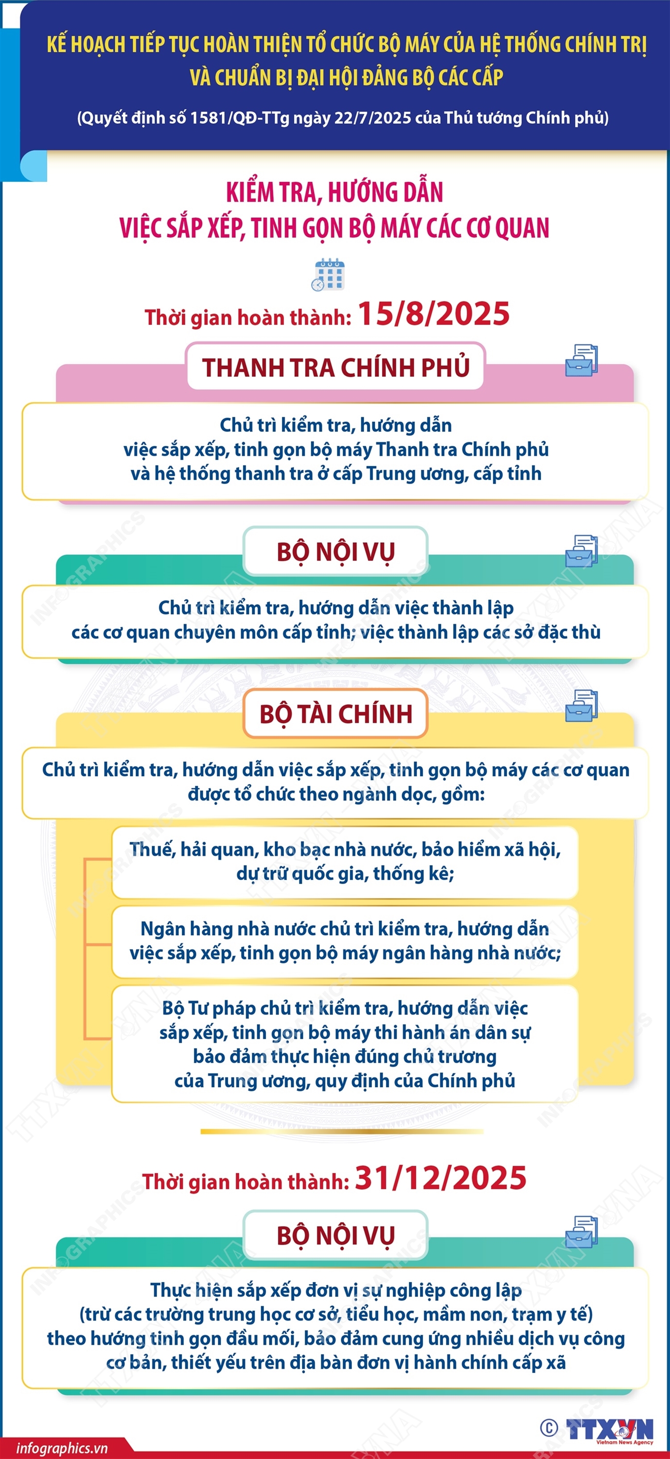 Phổ biến giáo dục Pháp luậtThông tin đồ họa Kế hoạch tiếp tục hoàn thiện tổ chức bộ máy của hệ thống chính trị và chuẩn bị Đại hội đảng bộ các cấp (Phần 1) Thứ hai, 28/07/2025 09:26 Hà Nội (TTXVN 26/7) Phó Thủ tướng Thường trực Nguyễn Hòa Bình ký Quyết định số 1581/QĐ-TTg ngày 22/7/2025 ban hành Kế hoạch tiếp tục hoàn thiện tổ chức bộ máy của hệ thống chính trị và chuẩn bị Đại hội đảng bộ các cấp. Kế hoạch nêu rõ các nhiệm vụ cụ thể, xác định cơ quan chủ trì, cơ quan phối hợp, sản phẩm và thời hạn phải hoàn thành.