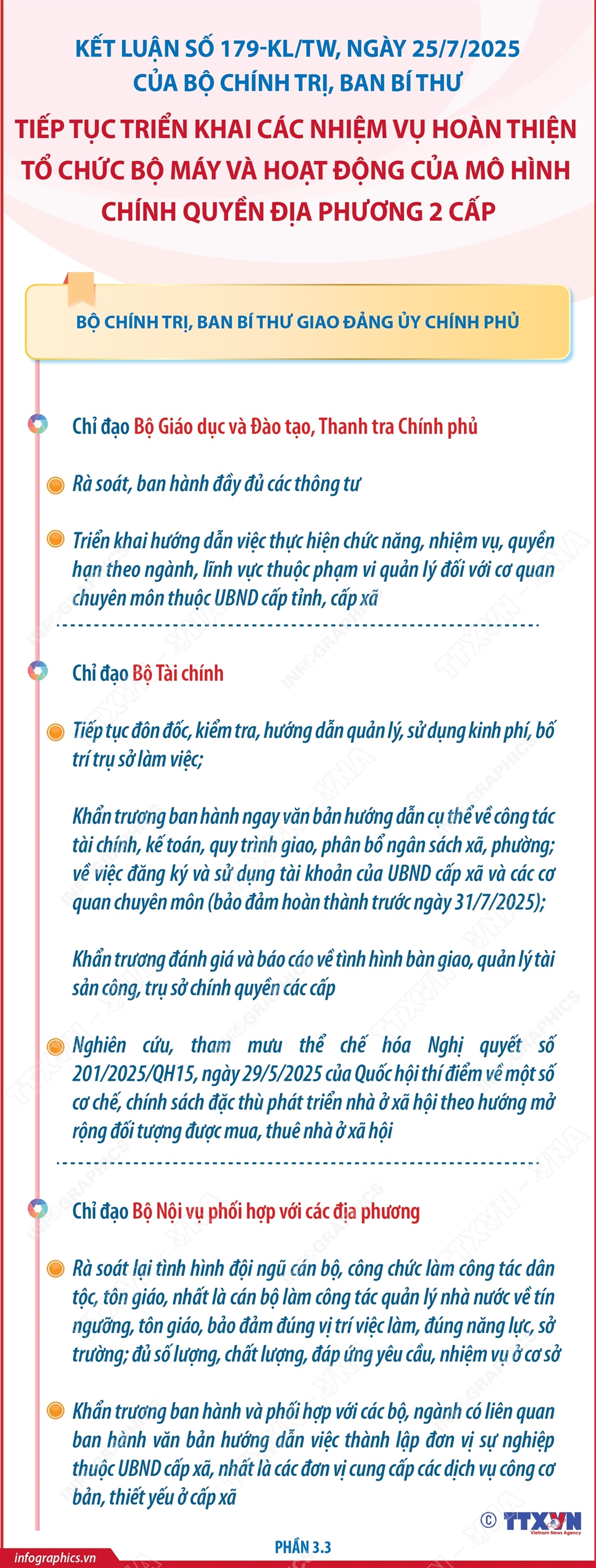 Phổ biến giáo dục Pháp luậtThông tin đồ họa Kết luận số 179-KL/TW: Nhiệm vụ của Đảng ủy Chính phủ (phần 3) Thứ hai, 28/07/2025 14:25 Hà Nội (TTXVN 26/7) Ngày 25/7/2025, Ủy viên Bộ Chính trị, Thường trực Ban Bí thư Trần Cẩm Tú ký ban hành Kết luận của Bộ Chính trị, Ban Bí thư về tiếp tục triển khai các nhiệm vụ hoàn thiện tổ chức bộ máy và hoạt động của mô hình chính quyền địa phương 2 cấp (Kết luận số 179-KL/TW). Bộ Chính trị, Ban Bí thư giao Đảng ủy Chính phủ các nhiệm vụ cụ thể để tiếp tục hoàn thiện tổ chức bộ máy và hoạt động của mô hình chính quyền địa phương 2 cấp.