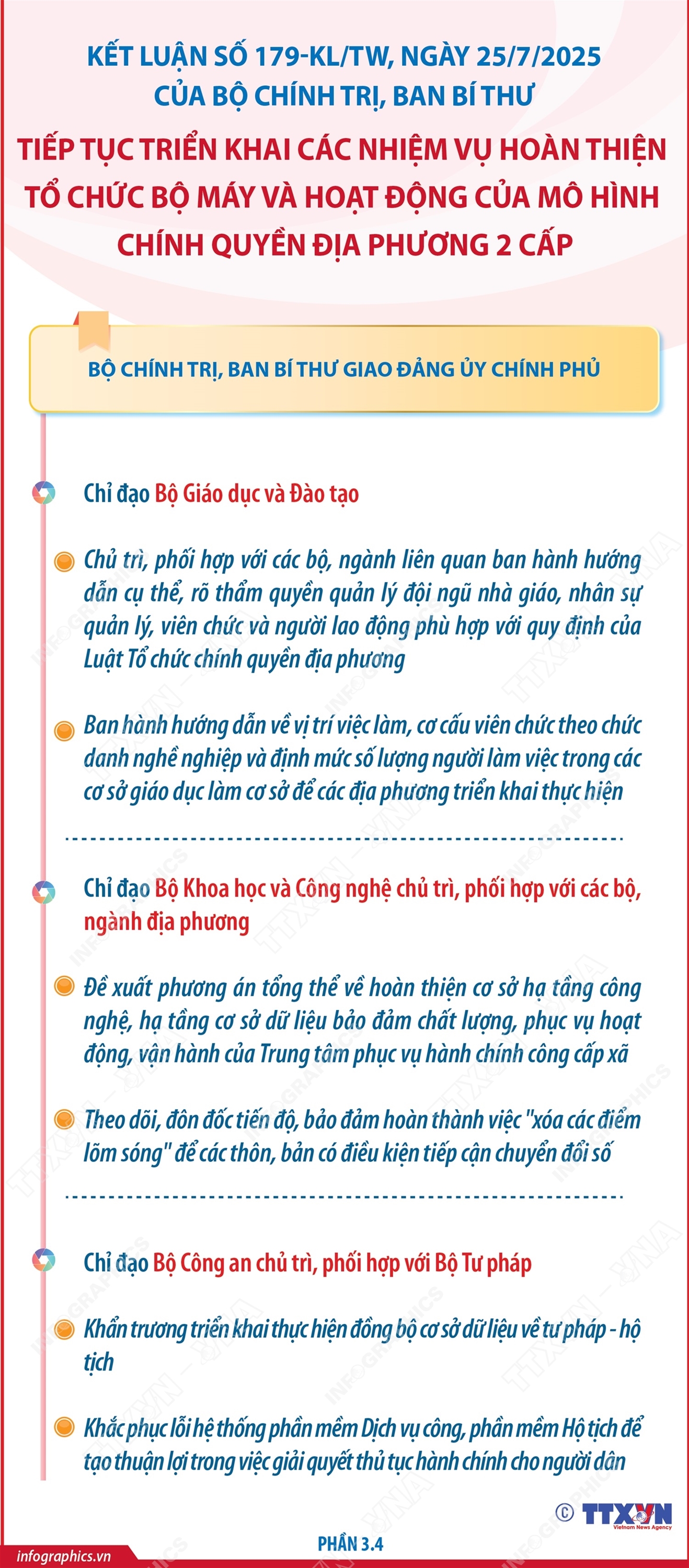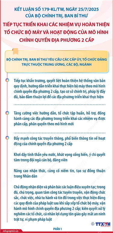 Phổ biến giáo dục Pháp luậtThông tin đồ họa Kết luận số 179-KL/TW: Nhiệm vụ của Đảng ủy Chính phủ (phần 4) Thứ hai, 28/07/2025 14:26 Hà Nội (TTXVN 26/7) Ngày 25/7/2025, Ủy viên Bộ Chính trị, Thường trực Ban Bí thư Trần Cẩm Tú ký ban hành Kết luận của Bộ Chính trị, Ban Bí thư về tiếp tục triển khai các nhiệm vụ hoàn thiện tổ chức bộ máy và hoạt động của mô hình chính quyền địa phương 2 cấp (Kết luận số 179-KL/TW). Bộ Chính trị, Ban Bí thư giao Đảng ủy Chính phủ các nhiệm vụ cụ thể để tiếp tục hoàn thiện tổ chức bộ máy và hoạt động của mô hình chính quyền địa phương 2 cấp.