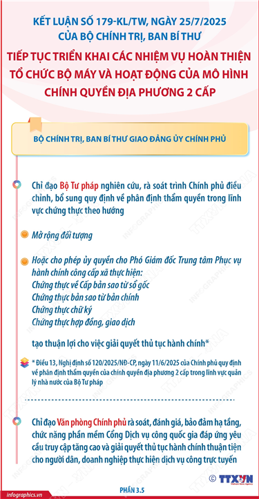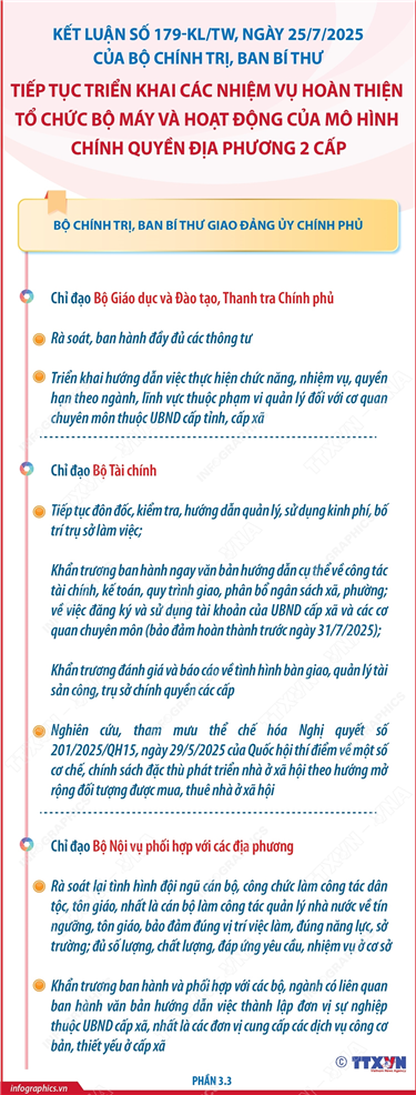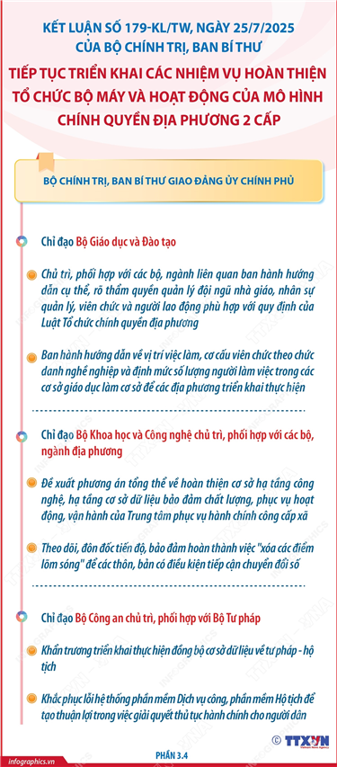 Tin cùng chuyên mục Kết luận số 179-KL/TW: Nhiệm vụ của Học viện Chính trị quốc gia Hồ Chí Minh28/07/2025 14:28Hà Nội (TTXVN 26/7) Ngày 25/7/2025, Ủy viên Bộ Chính trị, Thường trực Ban Bí thư Trần Cẩm Tú ký ban hành Kết luận của Bộ Chính trị, Ban Bí thư về tiếp tục triển khai các nhiệm vụ hoàn thiện tổ chức bộ máy và hoạt động của mô hình... Kết luận số 179-KL/TW: Nhiệm vụ của Ban Tổ chức Trung ương28/07/2025 14:28Hà Nội (TTXVN 26/7) Ngày 25/7/2025, Ủy viên Bộ Chính trị, Thường trực Ban Bí thư Trần Cẩm Tú ký ban hành Kết luận của Bộ Chính trị, Ban Bí thư về tiếp tục triển khai các nhiệm vụ hoàn thiện tổ chức bộ máy và hoạt động của mô hình... Kết luận số 179-KL/TW: Bộ Chính trị, Ban bí thư nghiêm túc phê bình các địa phương chậm kiện toàn nhân sự chủ chốt28/07/2025 14:27Hà Nội (TTXVN 26/7) Ngày 25/7/2025, Ủy viên Bộ Chính trị, Thường trực Ban Bí thư Trần Cẩm Tú ký ban hành Kết luận của Bộ Chính trị, Ban Bí thư về tiếp tục triển khai các nhiệm vụ hoàn thiện tổ chức bộ máy và hoạt động của mô hình... Kết luận số 179-KL/TW: Nhiệm vụ của Đảng ủy Chính phủ (phần 4)28/07/2025 14:26Hà Nội (TTXVN 26/7) Ngày 25/7/2025, Ủy viên Bộ Chính trị, Thường trực Ban Bí thư Trần Cẩm Tú ký ban hành Kết luận của Bộ Chính trị, Ban Bí thư về tiếp tục triển khai các nhiệm vụ hoàn thiện tổ chức bộ máy và hoạt động của mô hình... Kết luận số 179-KL/TW: Nhiệm vụ của Đảng ủy Chính phủ (phần 5)28/07/2025 14:26Hà Nội (TTXVN 26/7) Ngày 25/7/2025, Ủy viên Bộ Chính trị, Thường trực Ban Bí thư Trần Cẩm Tú ký ban hành Kết luận của Bộ Chính trị, Ban Bí thư về tiếp tục triển khai các nhiệm vụ hoàn thiện tổ chức bộ máy và hoạt động của mô hình... Kết luận số 179-KL/TW: Nhiệm vụ của Đảng ủy Chính phủ (phần 3)28/07/2025 14:25Hà Nội (TTXVN 26/7) Ngày 25/7/2025, Ủy viên Bộ Chính trị, Thường trực Ban Bí thư Trần Cẩm Tú ký ban hành Kết luận của Bộ Chính trị, Ban Bí thư về tiếp tục triển khai các nhiệm vụ hoàn thiện tổ chức bộ máy và hoạt động của mô hình...