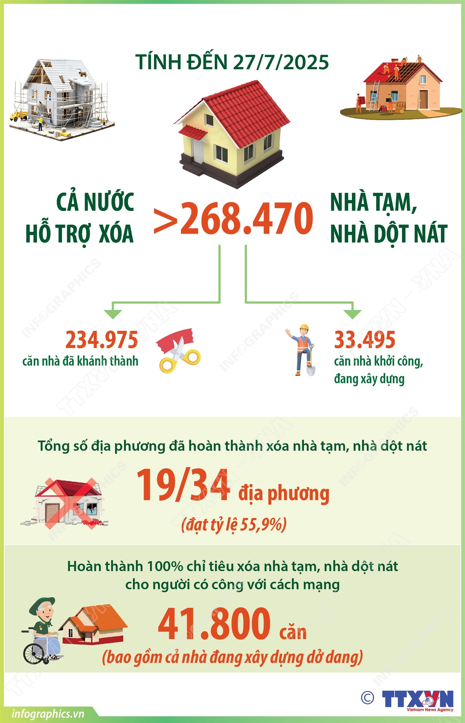 Phổ biến giáo dục Pháp luậtThông tin đồ họa Tính đến 27/7/2025: Cả nước hỗ trợ xóa hơn 268.470 nhà tạm, nhà dột nát Thứ ba, 29/07/2025 14:33 Hà Nội (TTXVN 28/7) Theo thông tin từ Bộ Dân tộc và Tôn giáo, tính đến ngày 27/7/2025, cả nước đã hỗ trợ xóa nhà tạm, nhà dột nát được 268.470 căn (trong đó khánh thành 234.975 căn; đang khởi công, xây dựng 33.495 căn). Công tác hỗ trợ nhà ở đối với người có công với cách mạng đã hoàn thành 100%, đạt khoảng 41.800 căn (bao gồm cả nhà đang xây dựng dở dang). Tổng số địa phương đã hoàn thành xóa nhà tạm, nhà dột nát là 19/34 địa phương (đạt tỷ lệ 55,9%)