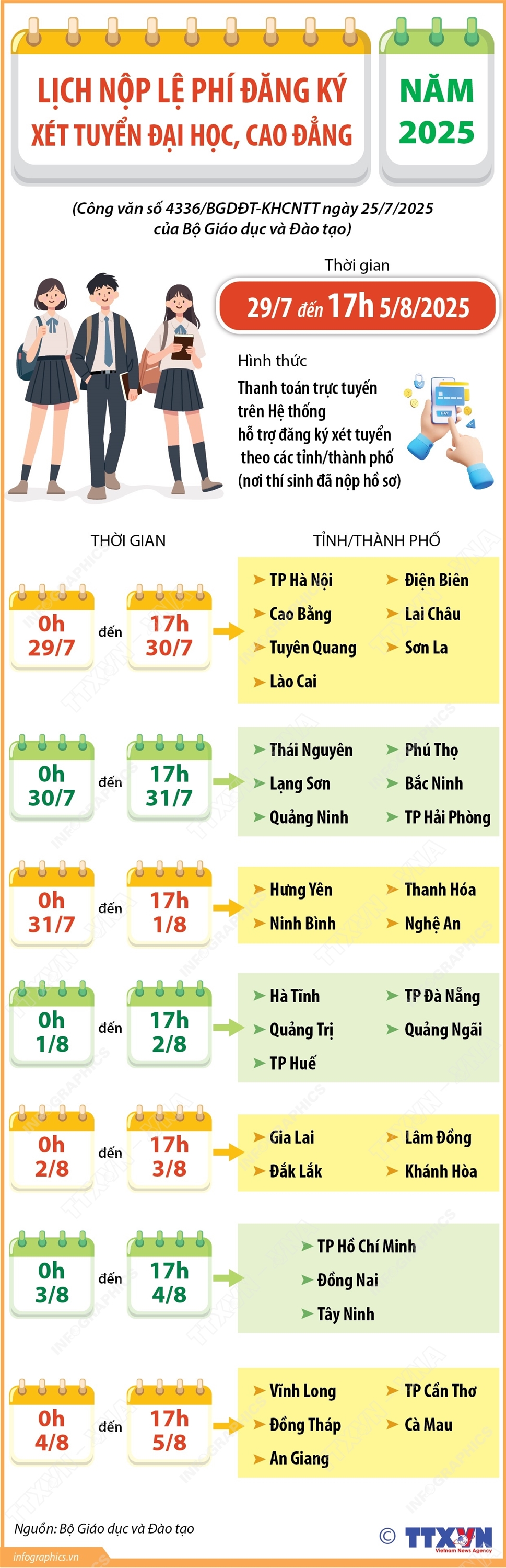 Phổ biến giáo dục Pháp luậtThông tin đồ họa Lịch nộp lệ phí đăng ký xét tuyển đại học, cao đẳng năm 2025 Thứ tư, 30/07/2025 14:42 Hà Nội (TTXVN 29/7) Theo Công văn số 4336/BGDĐT-KHCNTT ngày 25/7/2025 của Bộ Giáo dục và Đào tạo về việc triển khai thanh toán trực tuyến lệ phí đăng ký xét tuyển đại học, cao đẳng năm 2025, từ 0h ngày 29/7 đến 17h ngày 5/8/2025 là thời gian quy định để các thí sinh đăng ký xét tuyển đại học, cao đẳng năm 2025 nộp lệ phí xét tuyển. Thời gian nộp lệ phí xét tuyển được Bộ Giáo dục và Đào tạo phân chia theo các tỉnh, thành phố để bảo đảm thuận lợi, tránh hiện tượng quá tải.