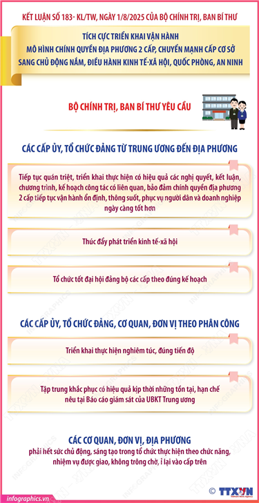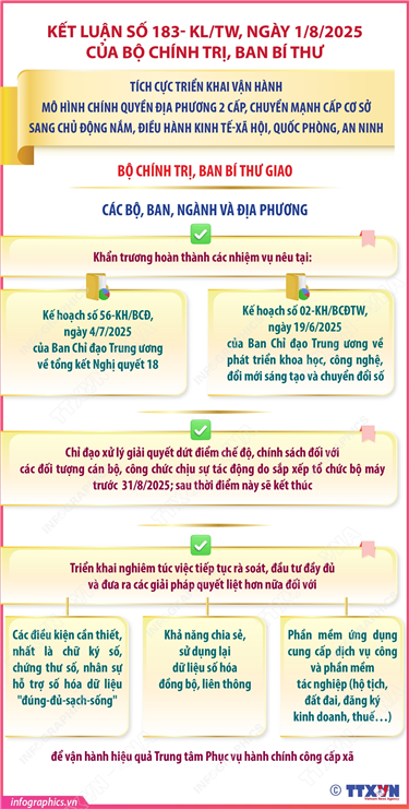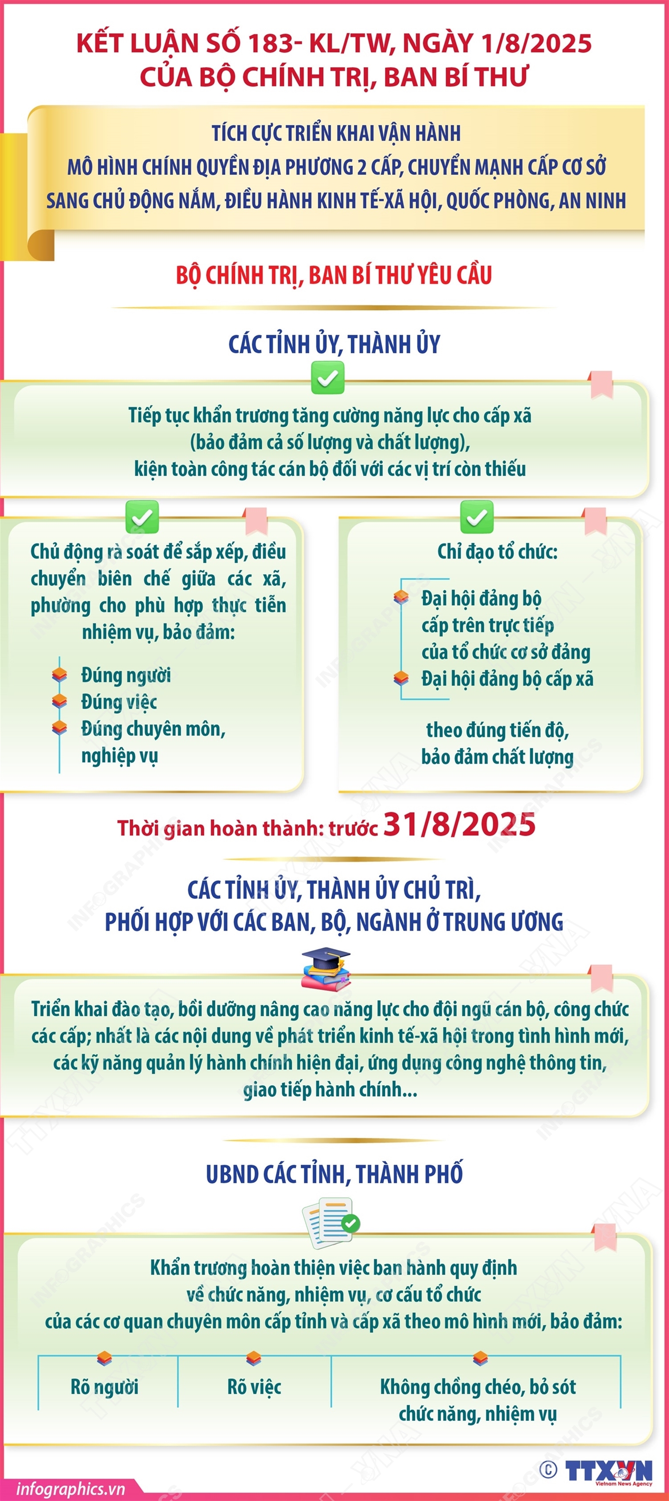 Phổ biến giáo dục Pháp luậtThông tin đồ họa Kết luận số 183- KL/TW: Nhiệm vụ của các tỉnh ủy, thành ủy Thứ hai, 04/08/2025 15:53 Hà Nội (TTXVN 4/8) Thay mặt Bộ Chính trị, Thường trực Ban Bí thư Trần Cẩm Tú ký ban hành Kết Luận số 183- KL/TW, ngày 1/8/2025 của Bộ Chính trị, Ban Bí thư về tích cực triển khai vận hành mô hình chính quyền địa phương 2 cấp, chuyển mạnh cấp cơ sở sang chủ động nắm, điều hành kinh tế-xã hội, quốc phòng, an ninh. Bộ Chính trị, Ban Bí thư yêu cầu các tỉnh ủy, thành ủy tiếp tục khẩn trương tăng cường năng lực cho cấp xã (bảo đảm cả số lượng và chất lượng), kiện toàn công tác cán bộ đối với các vị trí còn thiếu; chủ động rà soát để sắp xếp, điều chuyển biên chế giữa các xã, phường cho phù hợp thực tiễn nhiệm vụ, bảo đảm đúng người, đúng việc, đúng chuyên môn, nghiệp vụ; chỉ đạo tổ chức đại hội đảng bộ cấp trên trực tiếp của tổ chức cơ sở đảng, đại hội đảng bộ cấp xã theo đúng tiến độ, bảo đảm chất lượng (toàn bộ các nhiệm vụ này phải hoàn thành trước ngày 31/8/2025)….