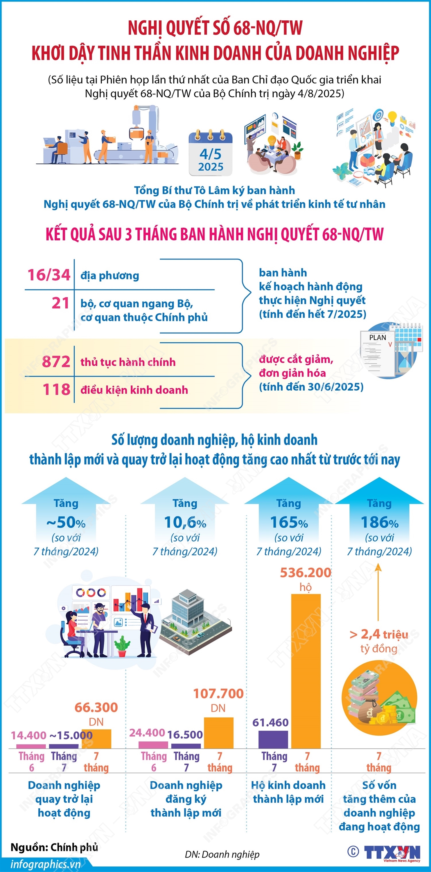 Phổ biến giáo dục Pháp luậtGiải đáp pháp luật Nghị quyết số 68-NQ/TW: Khơi dậy tinh thần kinh doanh của doanh nghiệp Thứ ba, 05/08/2025 08:29 Hà Nội (TTXVN 6/8) Ngày 4/8/2025, tại Trụ sở Chính phủ, Thủ tướng Phạm Minh Chính - Trưởng ban Chỉ đạo Quốc gia triển khai Nghị quyết 68-NQ/TW của Bộ Chính trị về phát triển kinh tế tư nhân chủ trì Phiên họp lần thứ nhất của Ban Chỉ đạo. Sau 3 tháng triển khai, Nghị quyết 68 đã thực sự khơi dậy tinh thần kinh doanh, giúp doanh nghiệp cảm thấy được khích lệ, đồng hành, lắng nghe. Tinh thần khởi nghiệp, lập nghiệp lên cao với số lượng doanh nghiệp, hộ kinh doanh thành lập mới và quay trở lại hoạt động tăng cao nhất từ trước tới nay, làn sóng khởi nghiệp gia tăng mạnh mẽ. Tháng 6/2025 ghi nhận cột mốc lịch sử khi số lượng doanh nghiệp thành lập mới đạt hơn 24,4 nghìn, tăng 60,5% so với cùng kỳ năm 2024, cao gấp 2 lần mức trung bình giai đoạn 2021 - 2024. Tháng 7/2025, cả nước có thêm hơn 16,5 nghìn doanh nghiệp đăng ký, đưa tổng số doanh nghiệp thành lập 7 tháng đầu năm lên 107,7 nghìn, tăng 10,6%; số vốn tăng thêm của doanh nghiệp đang hoạt động đạt hơn 2,4 triệu tỷ đồng, tăng hơn 186% so với cùng kỳ năm 2024.