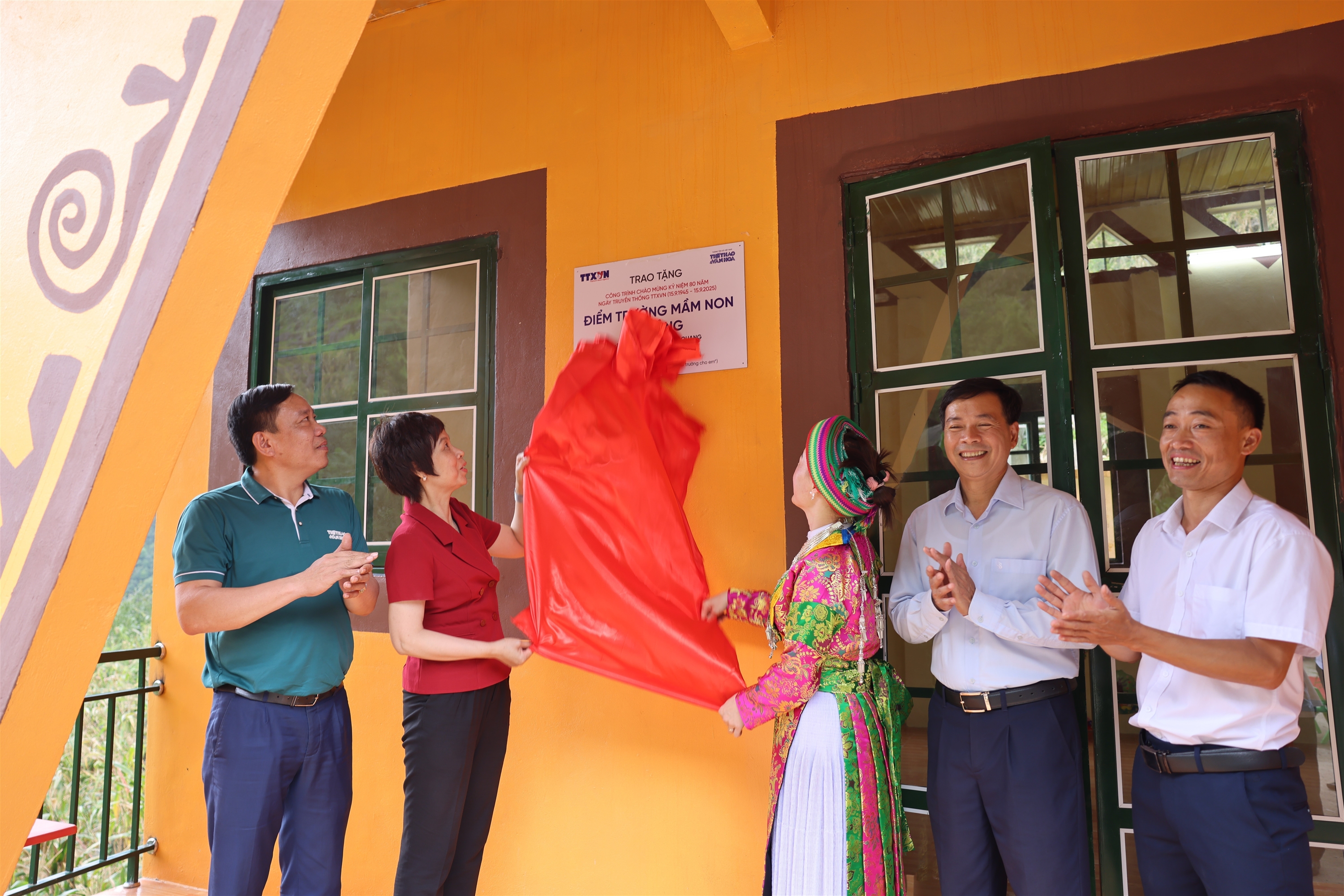 | Bí thư Đảng ủy, Tổng giám đốc TTXVN Vũ Việt Trang cùng các đại biểu thực hiện nghi thức khánh thành và bàn giao phòng học mới tặng thầy và trò Điểm trường Mầm non Đề Lảng, Trường mầm non Giàng Chu Phìn, xã Mèo Vạc, tỉnh Tuyên Quang, ngày 8/8 |