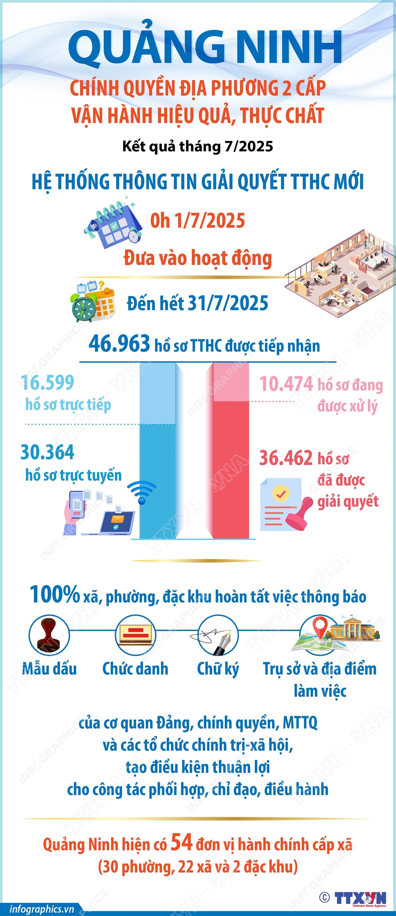 Phổ biến giáo dục Pháp luậtThông tin đồ họa Quảng Ninh: Chính quyền địa phương 2 cấp vận hành hiệu quả, thực chất Thứ hai, 11/08/2025 08:48 Hà Nội (TTXVN 8/8) Sau một tháng (từ 1/7/2025) chính thức vận hành mô hình chính quyền địa phương 2 cấp, Quảng Ninh đã đạt được những kết quả quan trọng bước đầu. Tổ chức bộ máy ổn định, cán bộ cơ sở thích ứng nhanh, chất lượng phục vụ người dân, doanh nghiệp ngày càng được nâng cao. Đây là tiền đề quan trọng để tiếp tục cải cách mạnh mẽ, xây dựng nền hành chính hiện đại, minh bạch, hiệu quả - lấy người dân làm trung tâm phục vụ.