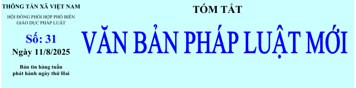 Phổ biến giáo dục Pháp luậtBản tin văn bản Pháp luật Tóm tắt Văn bản pháp luật mới: số 31 ngày 11/8/2025 của Hội đồng phối hợp Phổ biến giáo dục pháp luật TTXVN Thứ ba, 12/08/2025 08:53 Phòng Tổng hợp - Kiểm tra - Pháp chếThường trực Hội đồng phối hợp Phổ biến, giáo dục pháp luật TTXVN