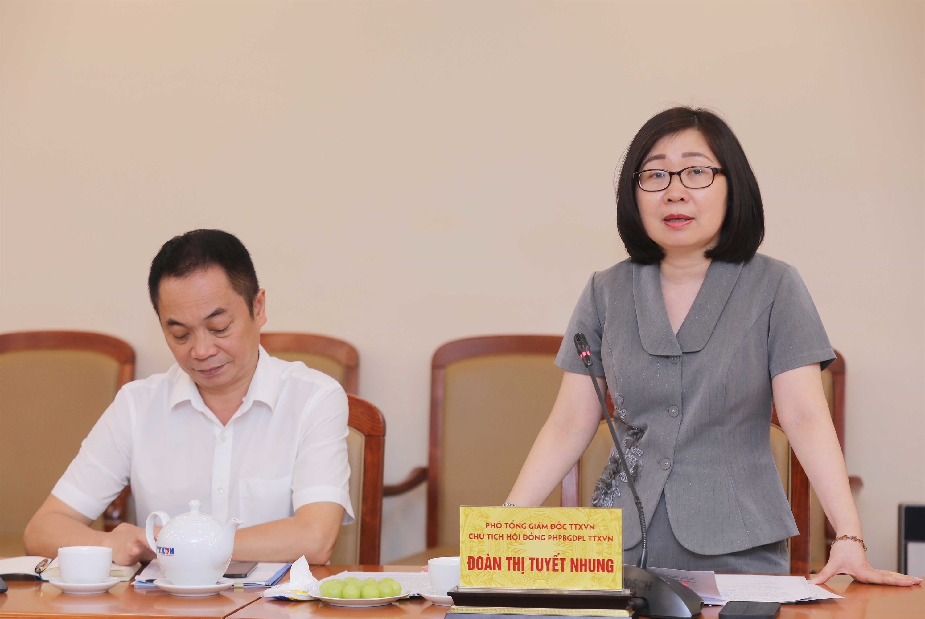 Phát biểu tại buổi làm việc, Phó tổng giám đốc Đoàn Thị Tuyết Nhung, Chủ tịch HĐPHPBGDPL TTXVN nhấn mạnh, thời gian tới, TTXVN tiếp tục bám sát các chỉ đạo của HĐPHPBGDPL Trung ương để thực hiện tốt công tác phổ biến, giáo dục pháp luật, chỉ đạo các đơn vị triển khai hiệu quả công tác truyền thông chính sách và thực hiện Nghị quyết số 66-NQ/TW bằng các loại hình thông tin, với nhiều ngôn ngữ trên các kênh thông tin của TTXVN.
