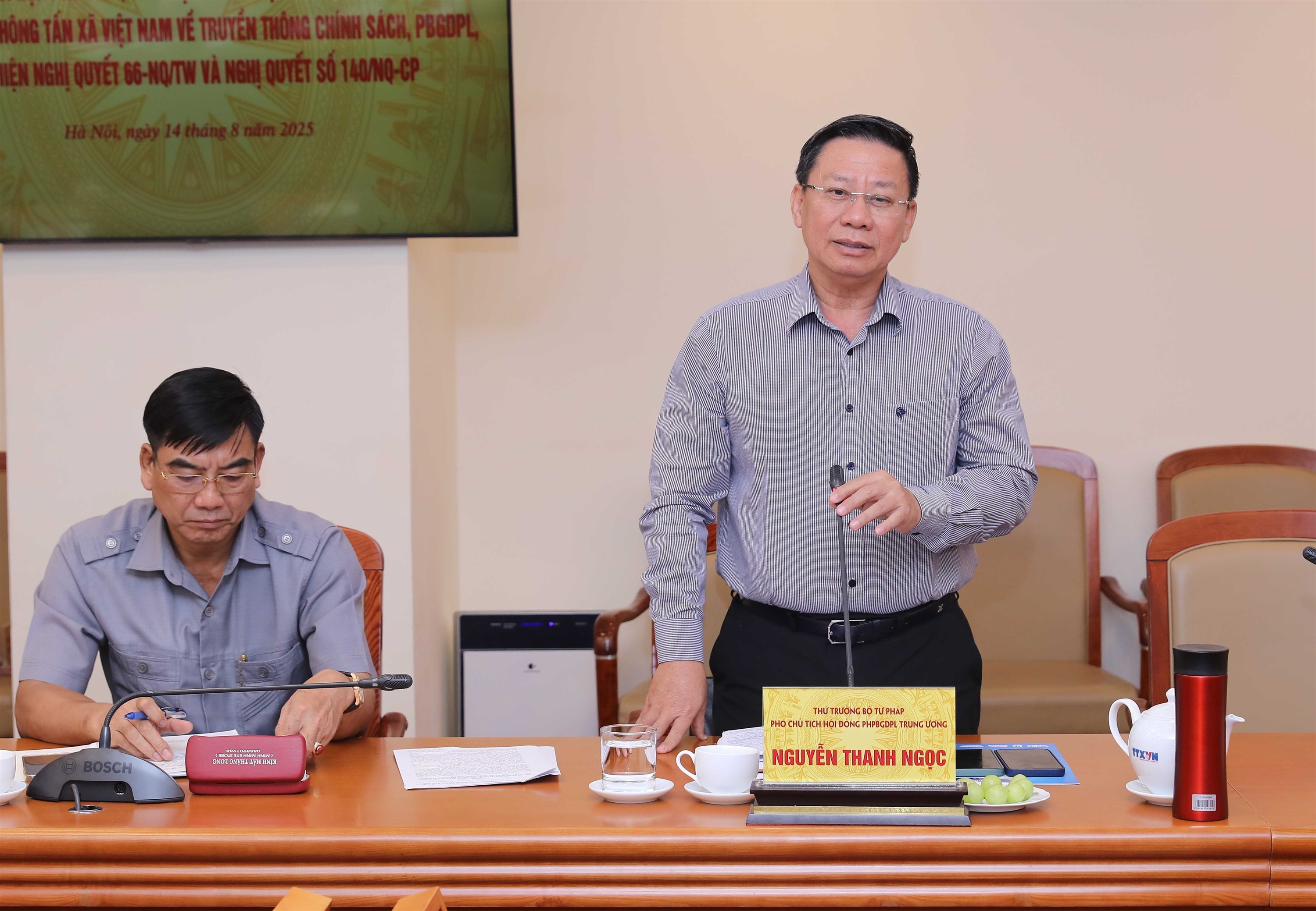 Sáng 14/8, tại Trung tâm Thông tấn quốc gia, Hà Nội, Đoàn công tác của Thường trực Hội đồng Phối hợp phổ biến, giáo dục pháp luật (HĐPHPBGDPL) Trung ương do Thứ trưởng Bộ Tư pháp Nguyễn Thanh Ngọc, Phó Chủ tịch Hội đồng làm Trưởng đoàn đã làm việc với Thông tấn xã Việt Nam (TTXVN).