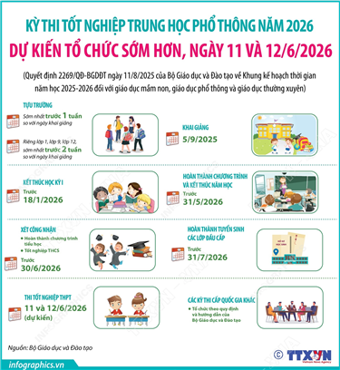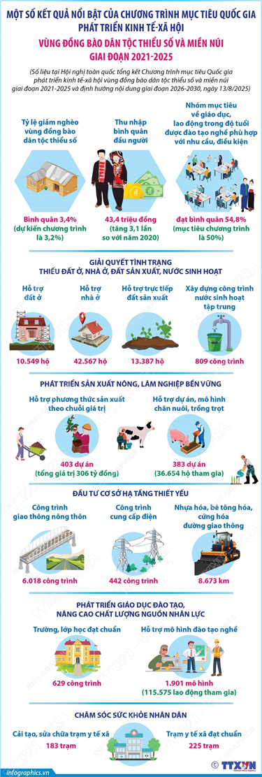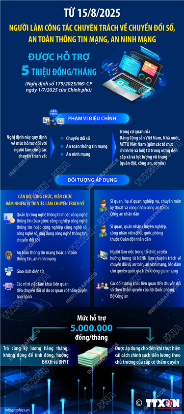Tin cùng chuyên mục Công an nhân dân - Lực lượng vũ trang trọng yếu, tin cậy của Đảng, Nhà nước và nhân dân19/08/2025 15:00Hà Nội (TTXVN 16/8) Trong bài viết “80 năm - Vinh quang Công an nhân dân Việt Nam”, Tổng Bí thư Tô Lâm khẳng định: 80 năm xây dựng, chiến đấu và trưởng thành đã khẳng định bản chất cách mạng, sức chiến đấu kiên cường của lực lượng Công an nhân... Logo Triển lãm “80 năm Hành trình Độc lập - Tự do - Hạnh phúc”: Sự kết tinh giữa giá trị lịch sử và khát vọng tương lai của dân tộc19/08/2025 14:59Hà Nội (TTXVN 16/8) Triển lãm "80 năm hành trình Độc lập - Tự do - Hạnh phúc" mở cửa miễn phí đón khách từ 9 - 22h các ngày từ 28/8 - 5/9/2025 tại Trung tâm Triển lãm Việt Nam (đường Trường Sa, xã Đông Anh, Hà Nội). Đây là sự kiện... Từ 15/8/2025: Người làm công tác chuyên trách về chuyển đổi số, an toàn thông tin mạng, an ninh mạng được hỗ trợ 5 triệu đồng/tháng15/08/2025 14:42Hà Nội (TTXVN 15/8) Theo Nghị định số 179/2025/NĐ-CP ngày 1/7/2025 của Chính phủ, từ 15/8/2025, người làm công tác chuyên trách về chuyển đổi số, an toàn thông tin mạng, an ninh mạng trong cơ quan của Đảng Cộng sản Việt Nam, Nhà nước, Mặt trận Tổ quốc Việt Nam (gồm... Một số kết quả nổi bật của Chương trình mục tiêu Quốc gia phát triển kinh tế-xã hội vùng đồng bào dân tộc thiểu số và miền núi giai đoạn 2021-202515/08/2025 14:41Hà Nội (TTXVN 13/8) Hội nghị toàn quốc tổng kết Chương trình mục tiêu quốc gia phát triển kinh tế-xã hội vùng đồng bào dân tộc thiểu số và miền núi giai đoạn 2021-2025 và định hướng nội dung giai đoạn 2026-2030 được tổ chức trực tiếp tại Trụ sở Chính phủ,... Ban Bí thư yêu cầu tiến hành đổi Thẻ đảng viên trong toàn Đảng13/08/2025 09:40Hà Nội (TTXVN 14/8) Thay mặt Ban Bí thư, Ủy viên Bộ Chính trị, Thường trực Ban Bí thư Trần Cẩm Tú đã ký ban hành Chỉ thị số 51-CT/TW (ngày 8/8/2025) về đổi Thẻ đảng viên. Chỉ thị số 51-CT/TW nêu rõ: Đổi Thẻ đảng viên mới được tiến hành nhân... Kỳ thi tốt nghiệp Trung học Phổ thông năm 2026 dự kiến tổ chức sớm hơn, ngày 11 và 12/6/202612/08/2025 09:06Hà Nội (TTXVN 12/8) Bộ Giáo dục và Đào tạo vừa ban hành Quyết định 2269/QĐ-BGDĐT về Khung kế hoạch thời gian năm học 2025-2026 đối với giáo dục mầm non, giáo dục phổ thông và giáo dục thường xuyên áp dụng trong toàn quốc. Theo đó, các trường...