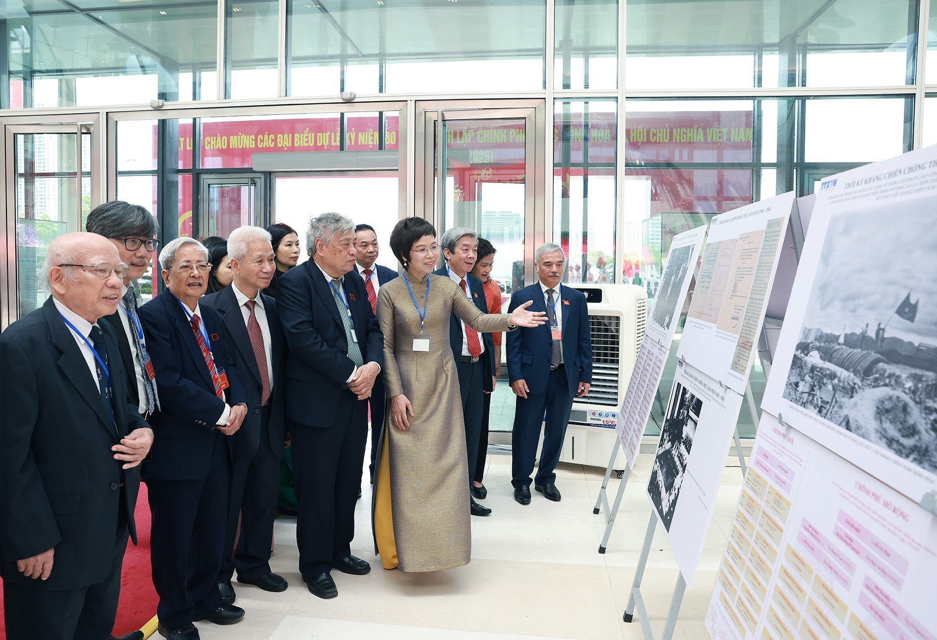 | Tổng giám đốc TTXVN Vũ Việt Trang giới thiệu với các đồng chí nguyên Lãnh đạo TTXVN trưng bày ảnh về hoạt động của Chính phủ qua các thời kỳ do TTXVN thực hiện, ngày 20/8 |