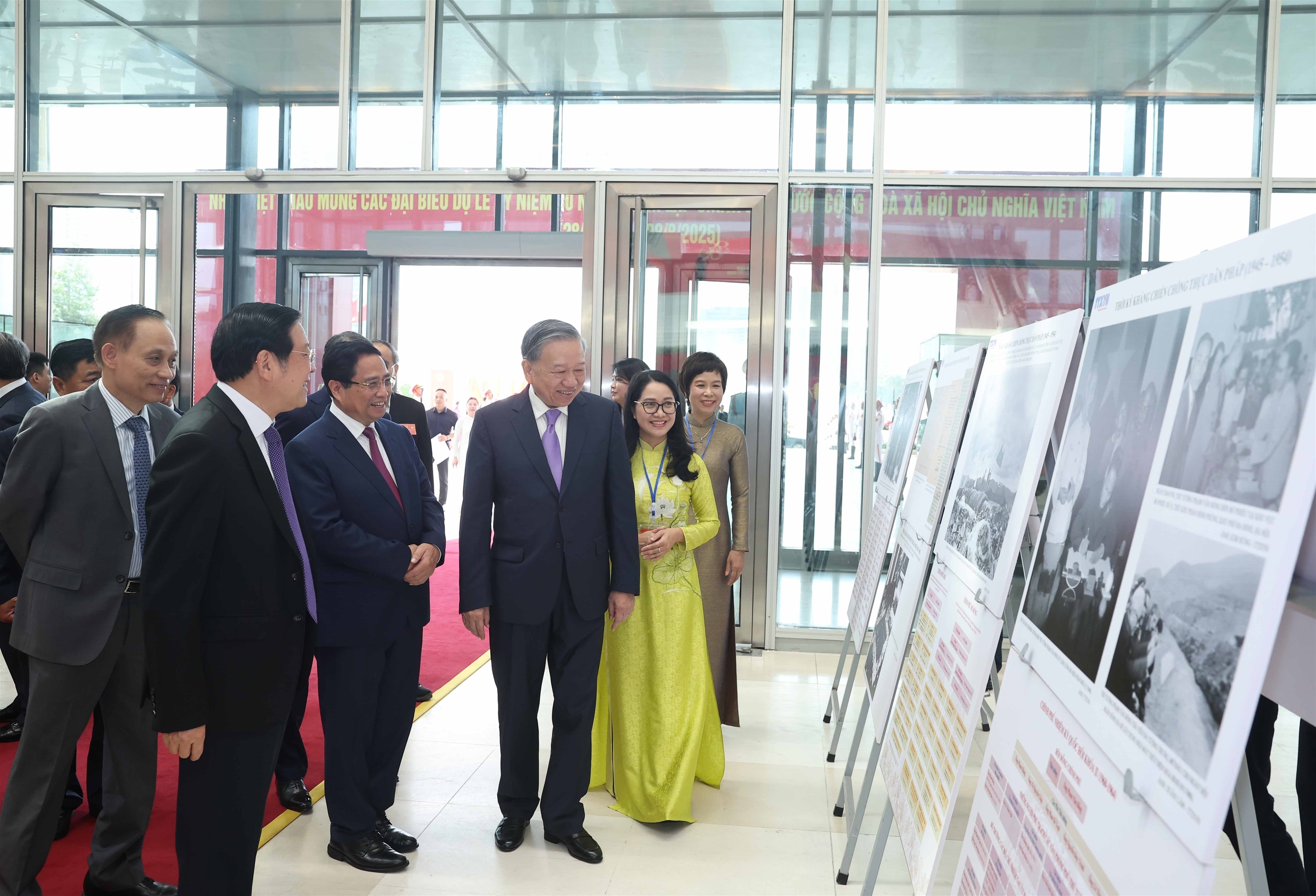 | Tổng Bí thư Tô Lâm và Thủ tướng Chính phủ Phạm Minh Chính cùng các đại biểu tham quan trưng bày ảnh về hoạt động của Chính phủ qua các thời kỳ do TTXVN thực hiện, ngày 20/8 |