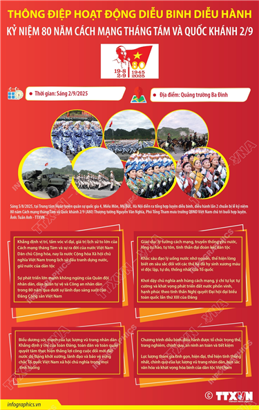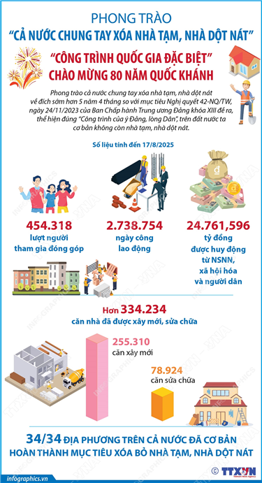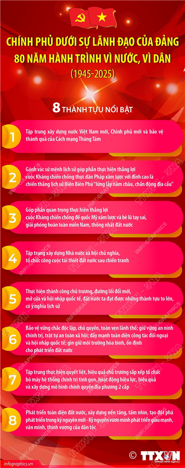 Tin cùng chuyên mục Nền tảng số “A80 - Tự hào Việt Nam”: Hỗ trợ tra cứu chuỗi hoạt động dịp Quốc khánh25/08/2025 15:19Hà Nội (TTXVN 23/8) Sau khi Hà Nội chính thức đưa vào sử dụng ứng dụng “A80 - Tự hào Việt Nam” để phục vụ người dân tra cứu thông tin lễ kỷ niệm, diễu binh, diễu hành 80 năm Cách mạng Tháng Tám thành công và Quốc khánh 2/9, hàng... Chính phủ dưới sự lãnh đạo của Đảng 80 năm hành trình vì nước, vì dân25/08/2025 15:18Hà Nội (TTXVN 20/8) Nhìn lại lịch sử 80 năm của Chính phủ qua các giai đoạn đầy cam go, thử thách nhưng cũng rất vẻ vang, vinh dự, tự hào của Cách mạng Việt Nam, dưới sự lãnh đạo của Trung ương Đảng, của Chủ tịch Hồ Chí Minh kính yêu, thường xuyên trực tiếp... 34/34 địa phương trên cả nước đã cơ bản hoàn thành mục tiêu xóa bỏ nhà tạm, nhà dột nát20/08/2025 15:04Hà Nội (TTXVN 19/8) Với 334.234 căn nhà được xây mới và sửa chữa, về đích sớm trước 5 năm 4 tháng so với mục tiêu Nghị quyết 42-NQ/TW, ngày 24/11/2023 của Ban Chấp hành Trung ương Đảng khóa XIII đề ra, phong trào cả nước chung tay xóa nhà tạm, nhà dột... Thông điệp hoạt động diễu binh diễu hành kỷ niệm 80 năm Cách mạng tháng Tám và Quốc khánh 2/919/08/2025 15:03Hà Nội (TTXVN 17/8) Tại buổi họp báo Chính phủ thường kỳ tháng 7/2025 diễn ra chiều 7/8, Thiếu tướng Tống Văn Thanh, Phó Cục trưởng Cục Tuyên huấn, Tổng cục Chính trị Quân đội Nhân dân Việt Nam: Việc tổ chức diễu binh diễu hành trong lễ kỷ niệm đã được Trung ương... Kết quả thực hiện đề án 1 triệu căn hộ nhà ở xã hội19/08/2025 15:02Hà Nội (TTXVN 17/8) Theo báo cáo đánh giá tình hình phát triển nhà ở xã hội 7 tháng đầu năm 2025 của Bộ Xây dựng, tính đến 31/7/2025, cả nước có 692 dự án nhà ở xã hội đang được triển khai với quy mô 633.559 căn. Trong... Các công tác trọng tâm của lực lượng Công an nhân dân trong kỷ nguyên vươn mình của đất nước19/08/2025 15:01Hà Nội (TTXVN 16/8) Trong bài viết “80 năm - Vinh quang Công an nhân dân Việt Nam”, Tổng Bí thư Tô Lâm khẳng định: Trong kỷ nguyên vươn mình của đất nước, trách nhiệm của lực lượng Công an nhân dân rất nặng nề nhưng vô cùng vinh quang. Lực lượng...