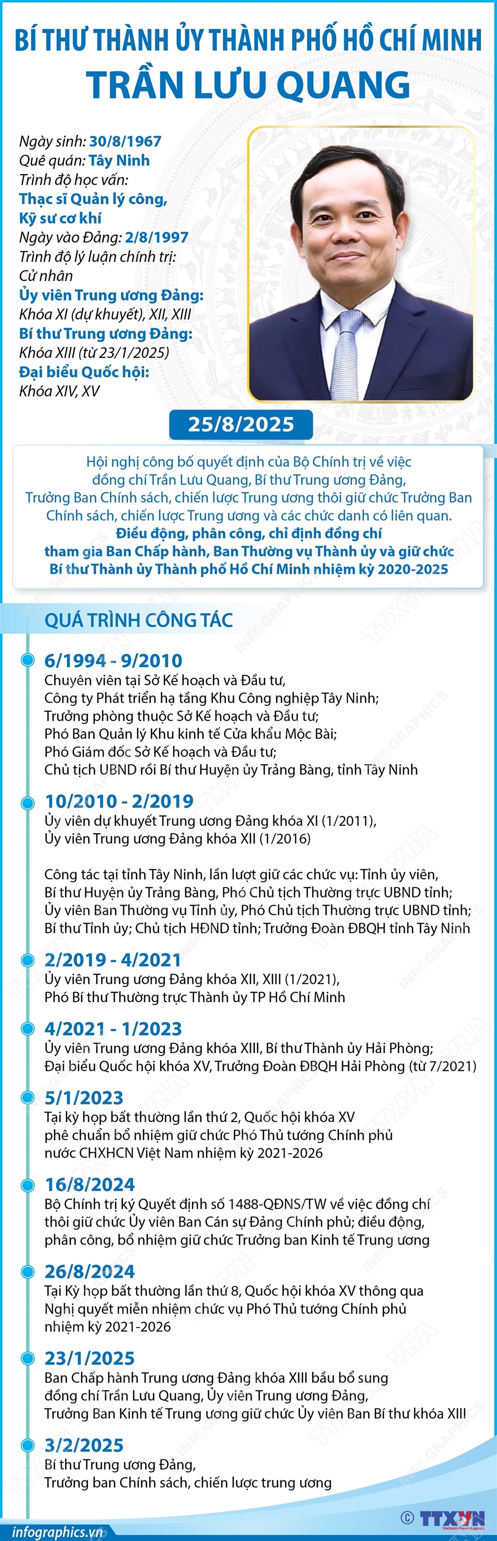 Phổ biến giáo dục Pháp luậtThông tin đồ họa Bí thư Thành ủy Thành phố Hồ Chí Minh Trần Lưu Quang Thứ ba, 26/08/2025 15:22 Hà Nội (TTXVN 25/8) Sáng 25/8/2025, Thành ủy Thành phố Hồ Chí Minh tổ chức Hội nghị công bố quyết định của Bộ Chính trị về công tác cán bộ. Theo Quyết định của Bộ Chính trị, đồng chí Trần Lưu Quang, Bí thư Trung ương Đảng, Trưởng Ban Chính sách, chiến lược Trung ương thôi giữ chức Trưởng Ban Chính sách, chiến lược Trung ương và các chức danh có liên quan. Điều động, phân công, chỉ định tham gia Ban Chấp hành, Ban Thường vụ Thành ủy và giữ chức Bí thư Thành ủy Thành phố Hồ Chí Minh nhiệm kỳ 2020-2025.